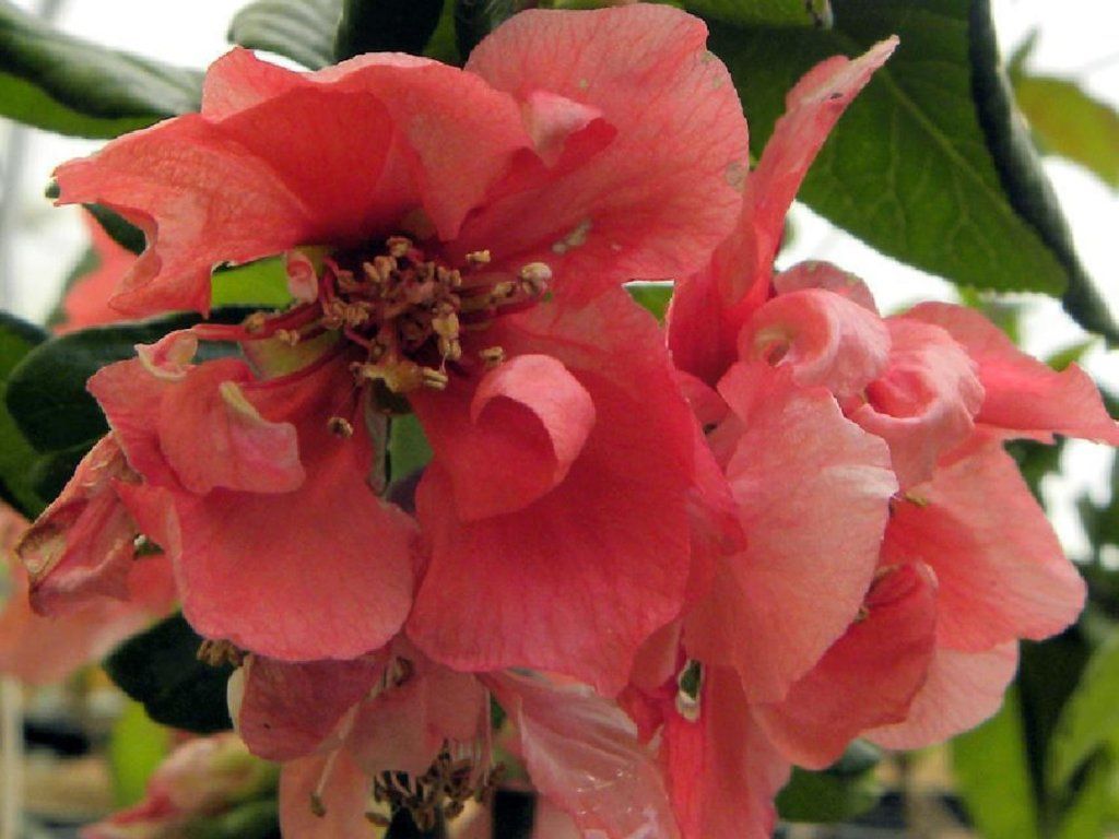 Zierquitte 'Orange Trail' - ein schön blühender Strauch, der bis zu 1 - 1,5 m hoch und ebenso breit wird. Er hat schmale, glänzende, dunkelgrüne Blätter mit einer leichten Spitze am Ende. Er verträgt Formschnitt gut. Die Blüten sind orange-rot bis lachsfarben, schalenförmig und gefüllt. Blüht sehr reichlich, von Ende April bis Anfang Mai. Im Herbst reifen dann gelbe und essbare Früchte, aus denen gerne Marmeladen und Gelees hergestellt werden.