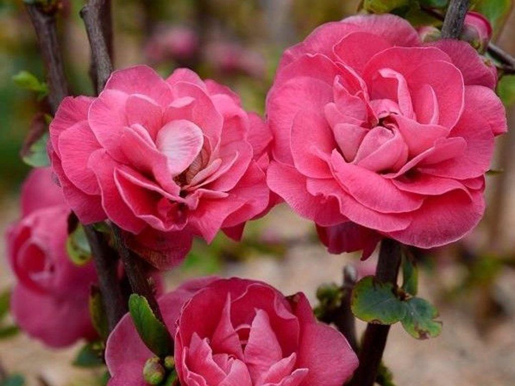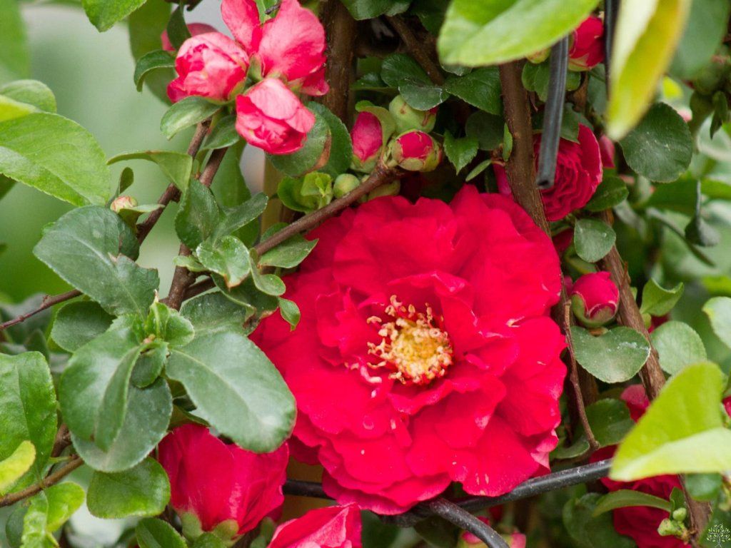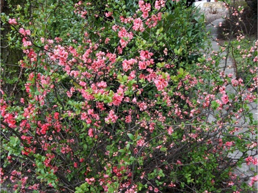 Zierquitte 'Pink Storm' - basiert auf Hybriden der Zierquitte und verwandter Arten, die seit Jahrzehnten in Europa als traditionelle Frühlingssträucher angebaut werden. Unter unseren Bedingungen erreicht 'Pink Storm' eine Höhe von ca. 1–1,5 m und eine Breite von 1–1,2 m und bildet einen dichten, breit halbkugelförmigen Strauch mit anfangs aufrechten, später leicht gebogenen Trieben. Viele Triebe sind nahezu dornenlos oder nur mit kurzen Dornen versehen, was den Schnitt und die Bewegung in der Nähe der Pflanzen erheblich erleichtert. Die Blätter sind elliptisch bis umgekehrt eiförmig, etwa 3–6 cm lang, im Frühjahr frischgrün mit einem zarten bronzefarbenen Schimmer, im Sommer tiefgrün und im Herbst verfärben sie sich gelblich. Von April bis Mai, manchmal bis Anfang Juni, trägt der Strauch große, etwa 4–5 cm breite, gefüllte Blüten in Rosatönen von zartem Lachsrosa bis zu einem kräftigeres Ziegelrosa. Die Blüten wachsen in Büscheln direkt an älteren Ästen und kürzeren Seitentrieben, oft auf noch unbelaubtem Holz, sodass die Farbe schon sehr früh zur Geltung kommt. In wärmeren Regionen kann sich die Blüte später in der Saison leicht wiederholen. Die Blüten werden von Bienen und Hummeln besucht. Im Gegensatz zu klassischen Zierquitten entwickelt dieser Kultivar nur wenige Früchte; eventuelle kleine Fruchtansätze haben hauptsächlich dekorativen Wert und sind nicht der Zweck des Anbaus. In der Gartengestaltung eignet sich 'Pink Storm' als kleiner Solitär im Rasen oder Vorgarten, in niedrigen, lockeren Hecken, an den Rändern von gemischten Strauchgruppen sowie in Kombination mit Rosen, Spiersträuchern, Tamarisken oder Ziergräsern, die an die Frühlingsblüte anschließen.
