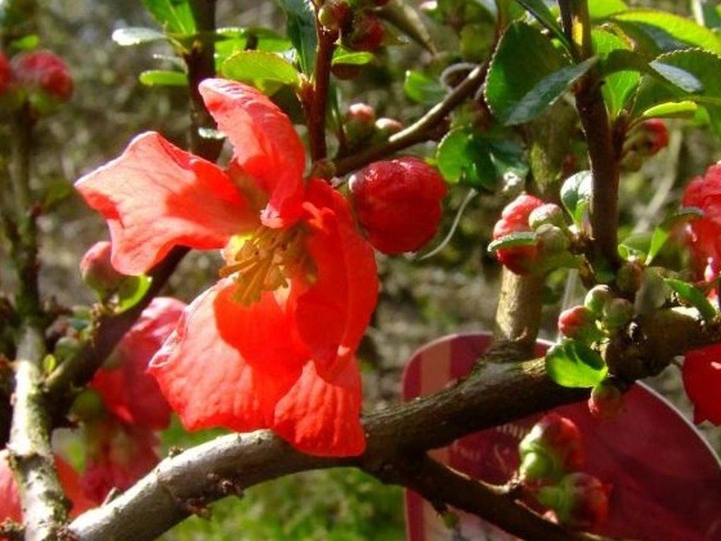 Zierquitte ist eine Hybridpflanze aus der Familie der Rosaceae und resultiert aus der Kreuzung zwischen den Arten Chaenomeles speciosa und Chaenomeles japonica. Diese Sorte ist oft unter den Namen Japanische Zierquitte oder Japanische Blütenquitte bekannt. Es handelt sich um einen laubabwerfenden Strauch, der für seine schönen Blüten und Früchte beliebt ist. Seine Größe hängt von der jeweiligen Sorte ab. Er blüht normalerweise im zeitigen Frühjahr, meist im späten Winter oder frühen Frühling, was dem Garten eine frühe Farbpalette verleiht. Die Blüten können verschiedene Schattierungen von Orange, Rot, Rosa oder Weiß haben und sind sehr dekorativ. Die Früchte, die nach der Blüte erscheinen, ähneln kleinen Äpfeln oder Birnen und können gelb oder grün sein. Obwohl sie wegen ihres sauren Geschmacks in rohem Zustand nicht für den menschlichen Verzehr geeignet sind, werden sie zur Herstellung von Marmeladen, Kompotten oder als dekoratives Element in Arrangements verwendet. Die Zierquitte zieht verschiedene Bestäuberarten an und bietet eine vielfältige Farb- und Texturpalette für den Garten, was sie zu einer beliebten Wahl für Zierpflanzungen macht. Aufgrund ihrer Schönheit und Anspruchslosigkeit können wir sie als schöne Kübelpflanze verwenden oder leicht einen anspruchslosen, aber schönen Bonsai daraus machen.