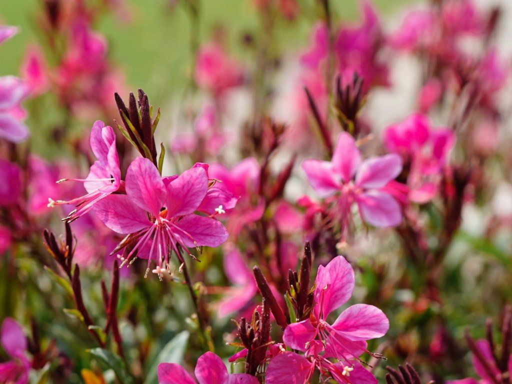 Gaura lindheimeri 'Flamingo Pink' - eine weitere Sorte der beliebten Staude, die Sie vor allem durch ihre üppige Blüte beeindrucken wird. Erreicht normalerweise eine Höhe von etwa 30-40 cm. Die Blüten wachsen auf hohen und kräftigen Stielen. Sie blühen ab Juni den ganzen Sommer bis September. Die Blüten sind in einem satten Rosa gefärbt. Die Prachtkerze ist eine schöne Pflanze, zum Beispiel für die Bepflanzung von Staudenbeeten, Steingärten oder für Gefäße. Er ist pflegeleicht und vollständig frostbeständig. Sie bringt Farbe und ein romantisches Aussehen in den Garten. Die Blätter sind schmal und mittellang und grün gefärbt.