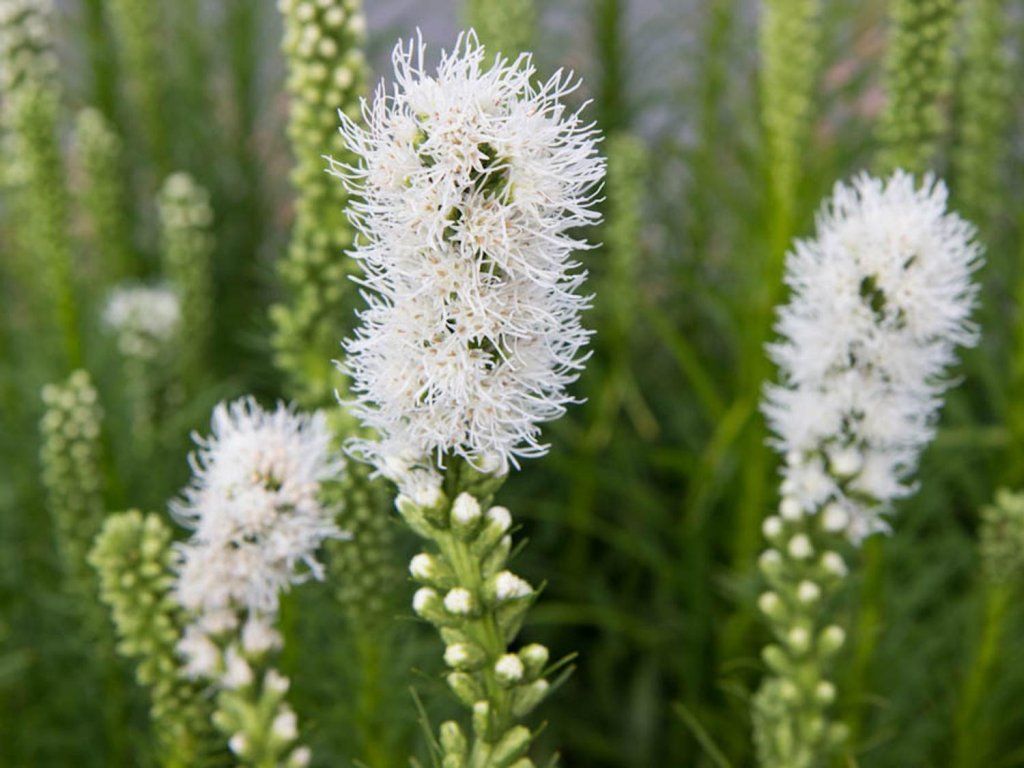 Liatris 'Alba' – eine bezaubernde Staude, bekannt für ihre eleganten Blüten und aufrechten Wuchs. Eine ausdauernde, horstbildende Pflanze aus nordamerikanischen Prärien und lichten Savannen, wo sie in tieferen, aber schnell austrocknenden Böden wächst. Die Sorte 'Alba' wurde wegen ihrer reinweißen Blütenstände ausgewählt, die Licht und eine klare Vertikale in Sommerbeete bringen. Aus einer bodennahen Rosette aus schmalen, linealen Blättern wachsen kräftige, wenig verzweigte Stängel, an deren Spitze sich von Juli bis August eine Ähre aus kleinen Köpfchen öffnet. Charakteristisch ist die Blüte von oben nach unten, sodass selbst eine einzelne Ähre länger „lebendig“ wirkt. Der Horst steht aufrecht, ist dornenlos und eignet sich gut als Schnitt- und Trockenblume. In Kompositionen ist sie ein natürlicher Partner für Präriestauden und -gräser, wie z. B. Sonnenhut, Prachtspiere und Hirse, wo die weiße Farbe die warmen Sommertöne abmildert. Ihre reinweißen Blüten verleihen dem Garten Helligkeit und Eleganz und ziehen lebenswichtige Bestäuber an. Im ausgewachsenen Zustand erreicht sie normalerweise eine Höhe von 0,6–0,8 m und eine Breite von etwa 0,3–0,6 m. Die Abstände werden mit 30–40 cm gewählt, was je nach gewünschter Dichte etwa 7–11 Pflanzen pro m² entspricht.