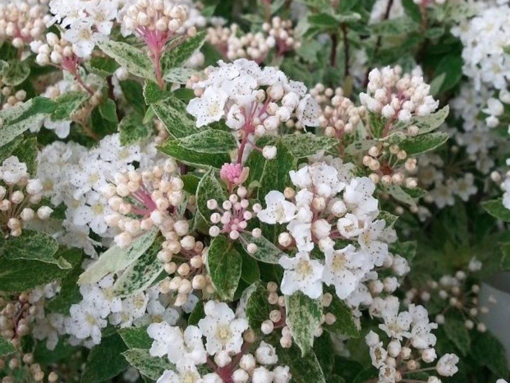 Spiraea x vanhouttei 'Pink Ice Catpan' - dieser interessante Kultivar erreicht eine Höhe von 100 - 140 cm. Die Blätter sind elliptisch bis verkehrt eiförmig, am oberen Rand gesägt, frischgrün mit starker weißer Sprenkelung, was sehr interessant wirkt. Die weiße Farbe ist manchmal stellenweise leicht rosafarben. Im Sommer kann das gesamte Blatt nur grün sein. Er blüht ab Juni mit weißen Blüten, die in dichten Blütenständen angeordnet sind, und blüht an den letztjährigen Trieben. Dieser Kultivar wirkt sehr zart.