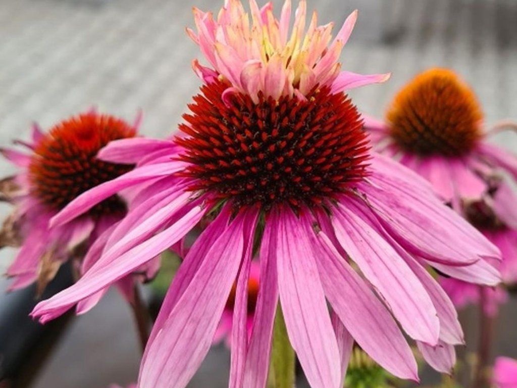 Echinacea purpurea 'Double Decker' - eine attraktive Sorte mit einzigartigen halbgefüllten Blüten. Wächst zu einer Höhe von etwa 1 Meter. Die Blüten haben eine leuchtend rosa Farbe mit einem ausgeprägten, rotbraunen Zentrum, das gewölbt und hervorstehend ist. Sie blüht von Juni bis September. Die Staude ist buchstäblich ein Anziehungspunkt für Schmetterlinge, Hummeln und Bienen. Die Blätter der Pflanze sind tiefgrün und lanzettförmig. Eine Kombination aus mehreren Sorten von Echinaceen wirkt schön, zum Beispiel im Vordergrund von niedrigeren grünen Sträuchern. Ein wahres Schmuckstück für jeden Garten.