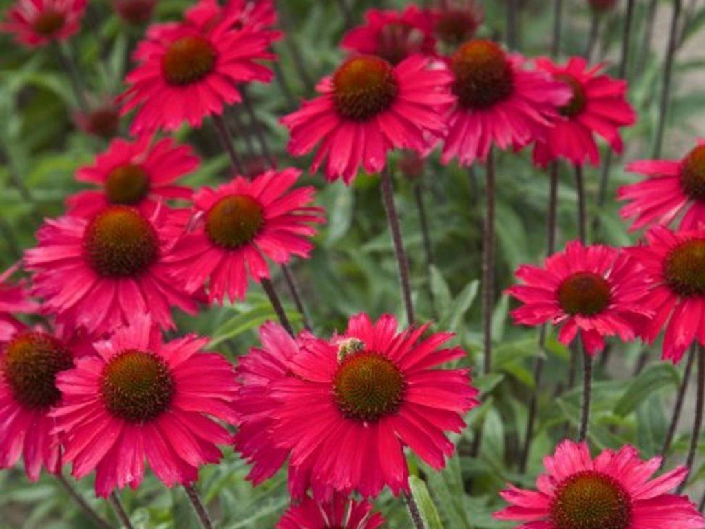 Purpur-Sonnenhut 'Sensation Pink' - eine anmutige Staude, die vor allem für ihre schönen Blüten geschätzt wird. Im ausgewachsenen Zustand erreicht sie eine Höhe von 50-60 cm. Die Blüten bestehen aus schmalen, eiförmigen Blütenblättern, die rot und in zarten Rosatönen gefärbt sind. Die Mitte der Blüte ist braun-gelb gefärbt. Die Blätter sind schmal, die Oberfläche ist leicht ledrig und sie sind tiefgrün gefärbt. Die Blütezeit beginnt im Juni und dauert den ganzen Sommer bis in den September. Diese Sorte eignet sich für die Pflanzung in einem Staudenbeet oder in Gefäßen, zum Beispiel auf der Terrasse. Insgesamt ist der Sonnenhut ein schönes Element für Gärten, der Farbe und ein romantisches Aussehen in jeden Garten bringt.
