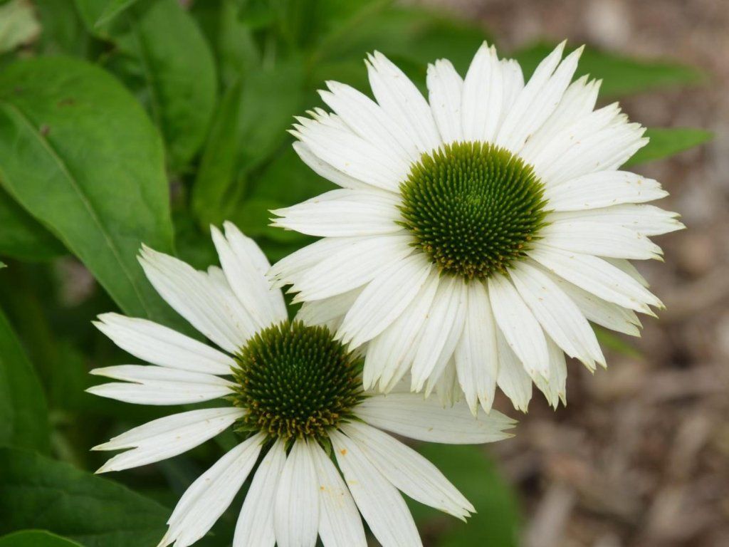 Echinacea 'Virgin' - eine schöne Sorte des beliebten Echinacea oder Sonnenhut, die sich durch kompaktes Wachstum und ungewöhnlich große Blüten auszeichnet. Sie erreicht eine Höhe von 60 cm und eine Breite von 40 cm. Charakteristisch sind die kräftigen Stiele, die dem Wind sehr gut widerstehen und an ihren Enden auffällige Blüten tragen. Die Blüten sind, wie der Name schon sagt, jungfräulich weiß und bilden einen wunderschönen Kontrast zur Umgebung. Sie sind ideal zum Schneiden und auch für Bestäuber äußerst attraktiv. Die Blütezeit ist von Juni bis September, abhängig von den Anbaubedingungen. Starke Stiele mit Blüten entspringen dichten Büscheln. Die Blätter der Echinacea sind dunkelgrün, ähnlich wie bei anderen Sorten der Purpur-Echinacea. Sie sind länglich und haben grob gesägte Ränder. Diese Pflanze passt mit ihrem Charakter hervorragend in Staudenbeete und naturnah gestaltete Gärten.