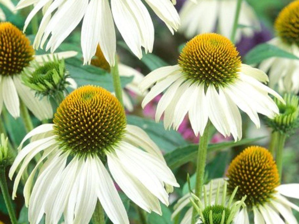 Echinacea purpurea 'White Swan' - eine nordamerikanische Präriestaude aus der Familie der Korbblütler, geschätzt für ihre lange Blütezeit und ihre Fähigkeit, Sommerhitze zu vertragen. Der Kultivar 'White Swan' gehört zu den hellen Auslesen, die die üblichen rosafarbenen Strahlen durch einen cremeweißen bis elfenbeinfarbenen Ton ersetzen und einen klaren Kontrast zu dunkleren Bepflanzungen bilden. Im ausgewachsenen Zustand bildet sie kräftige, horstartige Pflanzen von etwa 70–100 cm Höhe und etwa 40–50 cm Breite, mit rauen, dunkelgrünen, eiförmig-lanzettlichen Blättern und deutlicher Blattaderung. Von Juli bis September öffnen sich am Stielende Blütenkörbe von 8–12 cm Größe, deren weiße Zungenblüten sich leicht unterhalb eines gelb-orangenen, kegelförmigen Zentrums neigen. Die Blüten sind ausgeprägt bienenfreundlich, halten sich auch nach dem Schnitt gut und bieten nach der Blüte dekorative Samenköpfe. Im Beet eignet sie sich als heller Akzent zwischen blau blühenden Stauden, z. B. mit Salbei, Katzenminze und Lavendel, sowie im Präriestil auch mit Ziergräsern. Die Pflanze ist weder dornig noch giftig. Eine Kombination aus mehreren Sorten von Echinaceen wirkt schön, zum Beispiel im Vordergrund von niedrigeren grünen Sträuchern.