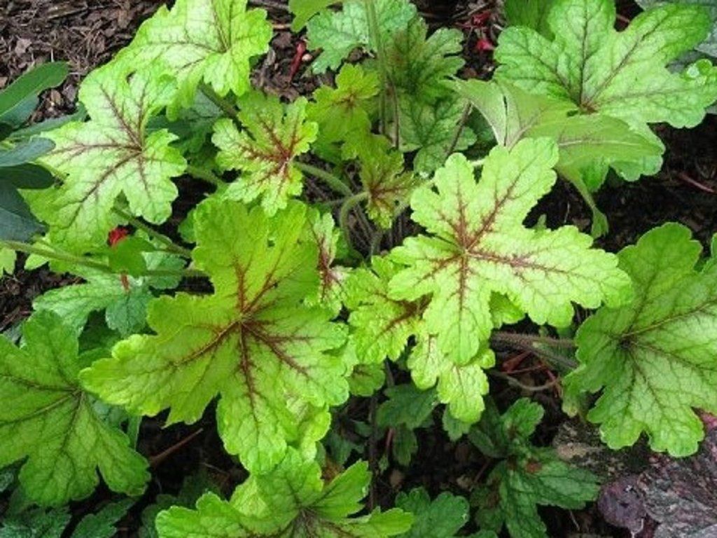 Heuchera 'Alabama Sunrise' - Staude mit attraktiv gefärbten Blättern. Im Frühling wachsen sie gelb mit roter Äderung, im Sommer wechseln sie die Farbe zu Grün. Wächst auf eine Höhe von 30-50 cm. Auf den Blütenstielen erscheinen im Juni und Juli kleine, weiße Blüten. Geeignete Standorte sind halbschattige Gartenbereiche.