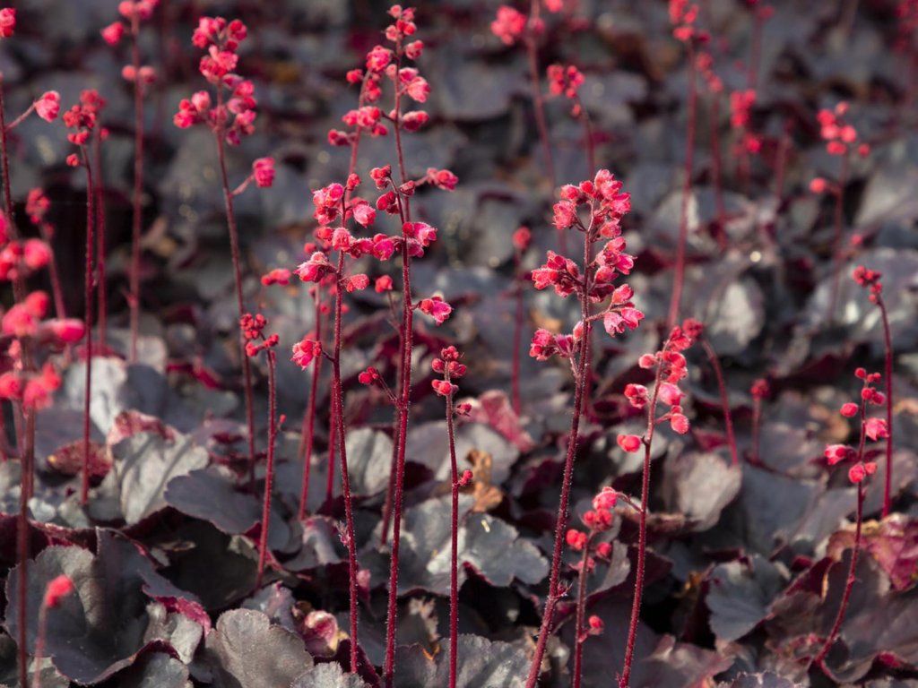 Heuchera 'Black Forest Cake' - immergrüne bis halbimmergrüne Staude aus der Familie der Steinbrechgewächse (Saxifragaceae), ursprünglich aus Nordamerika, vor allem geschätzt für ihr ganzjähriges Laub. Die Sorte 'Black Forest Cake' entstand in der Züchtung von Terra Nova Nurseries (USA) als gezielte Kreuzung und ist durch Pflanzenrecht und Patent (PP33532) geschützt. Die Pflanze bildet einen niedrigen, dicht polsterbildenden Horst mit glatteren, flach gelappten Blättern. Die Blattfarbe ist dunkel schokoladig bis fast schwarz mit einem purpurnen Unterton, auf älteren Blättern kann sich ein zarter kühler Schleier bilden. Das Laub erreicht normalerweise eine Höhe von 15–20 cm und eine Breite von 30–40 cm. Von Mai bis Juli wachsen schlanke Stängel von etwa 35–50 cm Höhe, die lockere Rispen kleiner glockenförmiger Blüten in kirschrot bis rosarot tragen. Die Blüten sind in der Regel geruchlos, bieten Nektar und Pollen für Bestäuber und wirken in der Vase leicht, fast zart. In Kompositionen wirkt sie als dunkler Akzent am Rand von Staudenbeeten, im Unterwuchs von Sträuchern und in Gefäßen, wo sie silberne Blätter (Brunnera, Beifuß), helle Funkien, Farne und zarte Ziergräser hervorhebt.