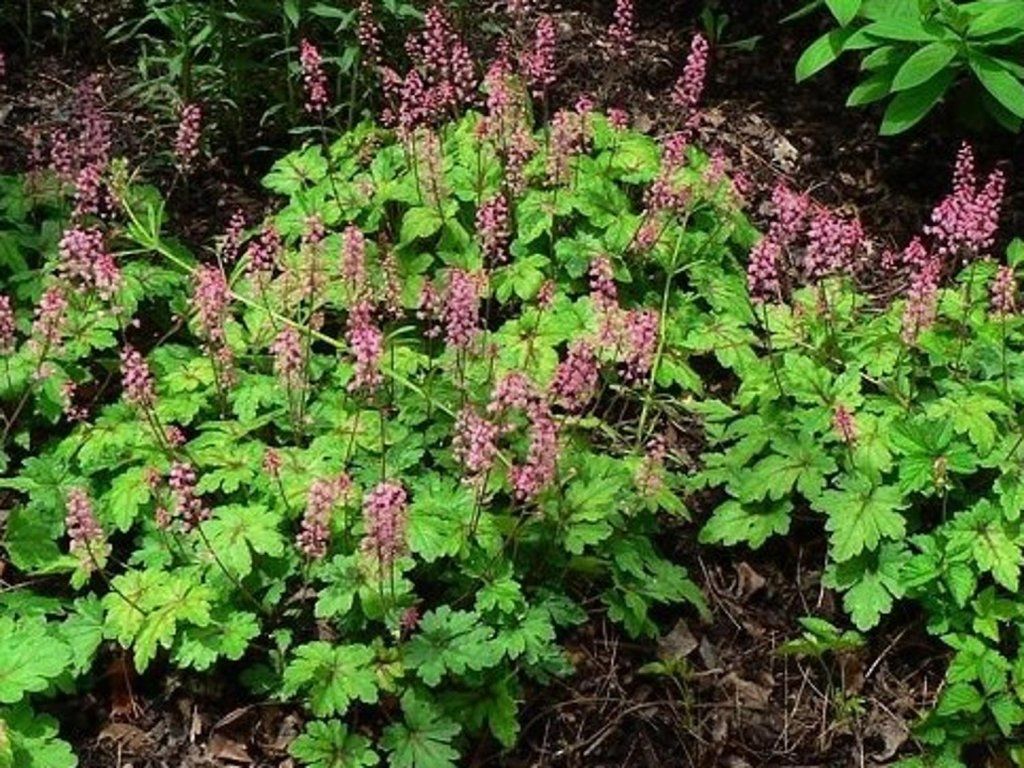 Heuchera 'Dayglow Pink' - Immergrüne Staude, die bis zu 15-35 cm hoch wird. Rosa Blütenstände erscheinen ab Juni und blühen den ganzen Sommer über. Die Blätter sind herzförmig, die Ränder gezackt und frischgrün gefärbt.