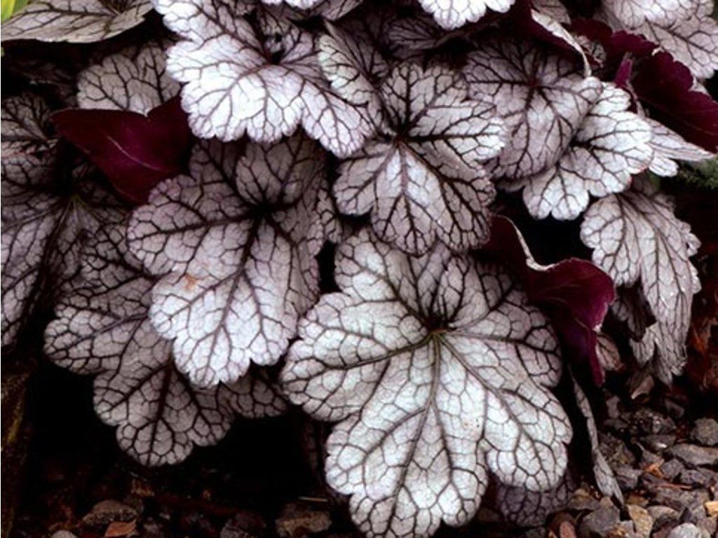 Heuchera 'Glitter' - kompakt wachsende, interessant kontrastierende Heuchera, die einen dichten Horst bildet und bis zu 40 cm hoch wird. Sie trägt große, silbrige Blätter, die deutlich mit schwarzen Adern und einer zarten violetten Oberseite verziert sind. Schöne und gesunde Blätter halten auch Minustemperaturen stand. Ihre Färbung variiert je nach Standort, wobei sie im Schatten weniger intensiv ist und im Halbschatten intensivere Farben annimmt. Von Mai bis Juli blüht sie mit leuchtend fuchsiafarbenen Blüten, die in aufrechten Rispen an dünnen weinroten Stielen wachsen. Ideal für jeden Garten und auch für die Kultivierung in Behältern geeignet. Sie werden gut zusammen mit Storchschnabel, Seggen und Funkien aussehen.