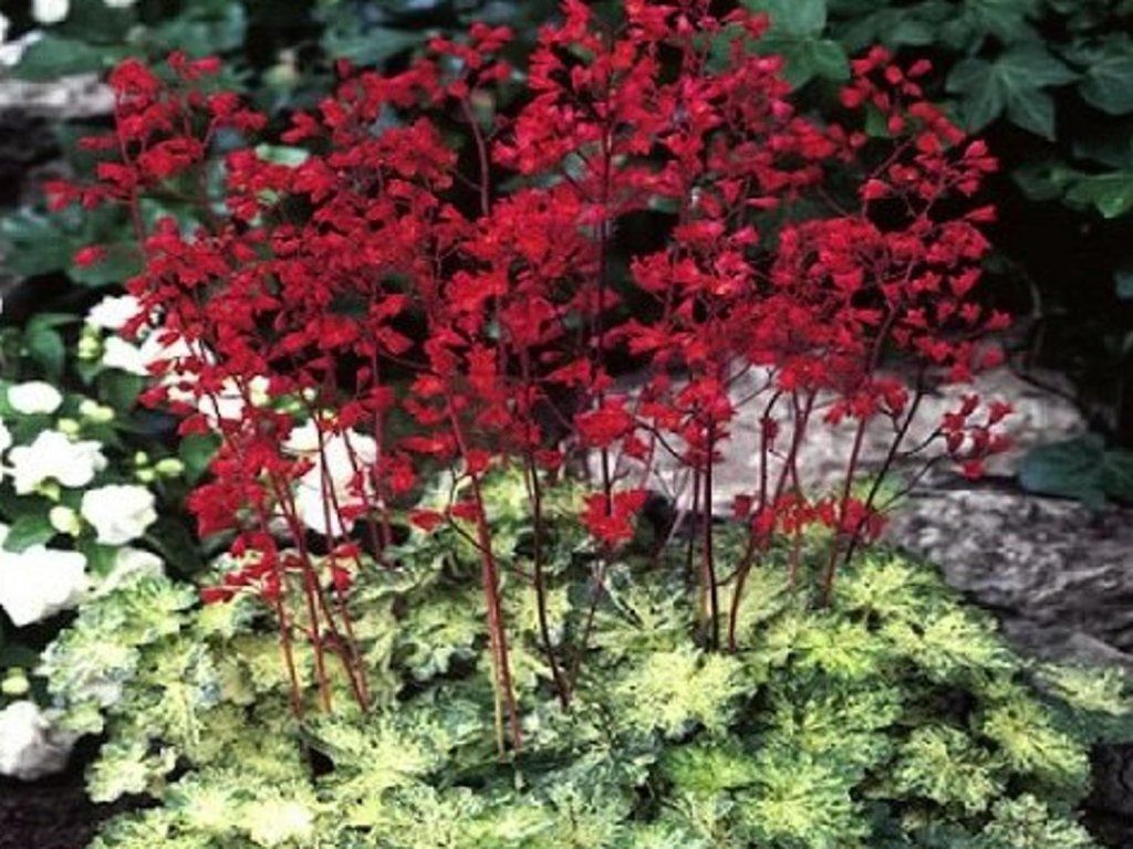 Heuchera 'Hercules®' (EU1874) - Wird bis zu 40 cm hoch. Rote Blüten erscheinen von Juni bis Juli. Die Blätter sind herzförmig mit gezackten Rändern. Große Blätter haben eine weiß panaschierte Färbung. Die Blattfarbe hängt vom Standort ab. Geeignet für die Pflanzung in Gruppen oder als Einfassung und zum Schnitt. Diese Sorte ist lizenzrechtlich geschützt, ihre Vermehrung ist ohne Zustimmung nicht gestattet.