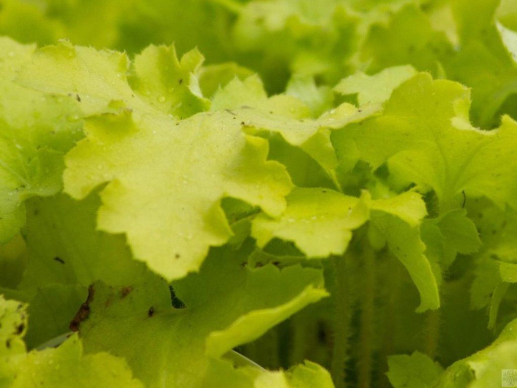 Heuchera 'Lime Marmalade' (PVR) - eine moderne Heuchera-Sorte, gezüchtet von der amerikanischen Baumschule Terra Nova Nurseries, bekannt für ihre Auswahl an Stauden mit auffälligem Laub. Diese Sorte zeichnet sich vor allem durch die Blattfarbe aus, die von einem frischen Limettengrün bis zu leicht gelbgrünen Tönen reicht und während des größten Teils der Vegetationsperiode stabil bleibt. Die Pflanze bildet kompakte, dichte Horste mit einer Höhe von etwa 25–35 cm und einer Breite von 30–45 cm. Die Blätter sind tief gelappt, stark gewellt und haben eine leicht glänzende Oberfläche, die ihre Struktur und Farbe bei Lichteinfall hervorhebt. Von Juni bis Juli erscheinen dünne, aufrechte Blütenstiele, die eine Höhe von etwa 40–50 cm erreichen und kleine, cremeweiße Blüten in lockeren Rispen tragen. Die Blüten wirken zart und luftig, wobei der Hauptdekorationswert auf den Blättern liegt. Die Sorte wird als kontrastierendes Element in Staudenpflanzungen eingesetzt, wo sie dunklere Bereiche aufhellt, sowie in Kübeln, an Beeträndern und als Unterpflanzung unter Laubgehölzen. Sie lässt sich gut mit Funkien, Farnen, Heucherella oder Ziergräsern kombinieren, wo sie Farbverläufe und Struktur in die Pflanzung bringt. Dank ihres immergrünen Charakters behält sie auch in den Wintermonaten ihren Zierwert, wenn die Blätter erhalten bleiben, auch wenn sie leicht dunkler werden oder einen bronzefarbenen Schimmer annehmen können.