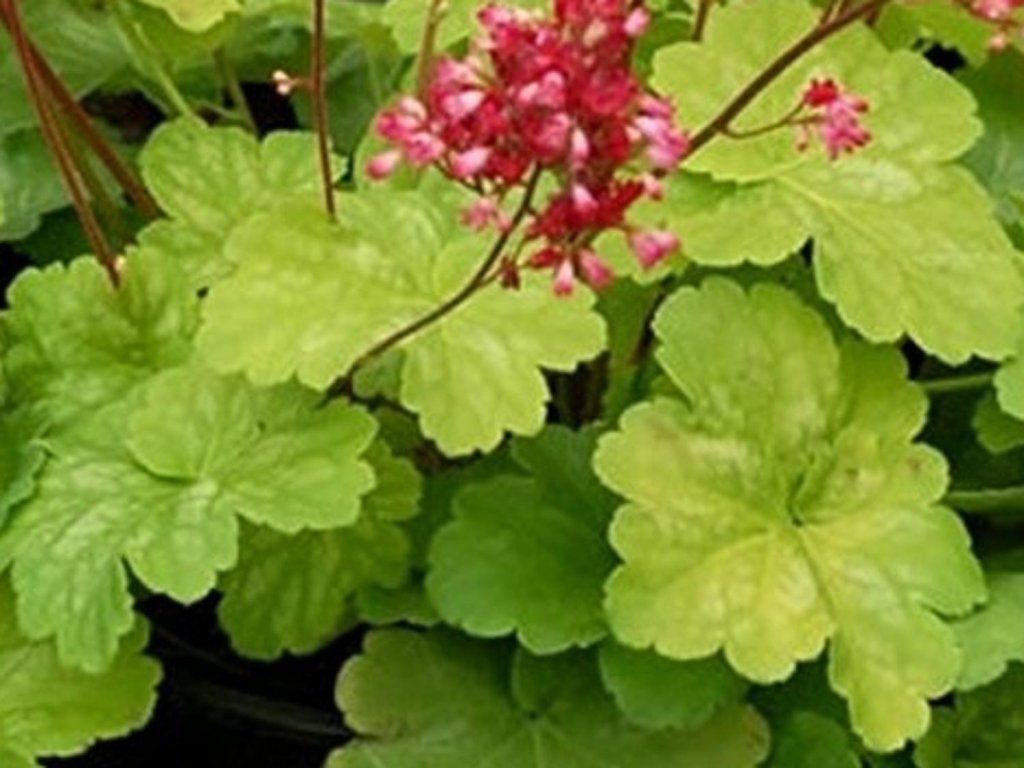 Heuchera 'Little Cutie Sweet Tart' (EU3706) - Anspruchslose, immergrüne Staude, die bis zu 30 cm hoch wird. Hellrosa Blüten erscheinen von Juni bis August. Die Blätter sind herzförmig mit gezackten Rändern. Große Blätter haben eine hellgrüne Färbung. Die Blattfarbe hängt vom Standort ab. Geeignet für die Pflanzung in Gruppen oder als Einfassung und zum Schnitt.