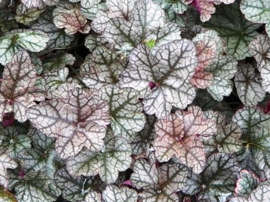 Heuchera 'Silver Scrolls' - Wird bis zu 35cm hoch. Weiße Blüten erscheinen von Juni bis August. Die Blätter sind rundlich, flach mit gezackten Rändern. Große, glänzende Blätter haben eine dunkelgrüne Färbung mit silberner Marmorierung und weinroten Adern. Die Blattfarbe hängt vom Standort ab. Geeignet für die Pflanzung in Gruppen oder als Einfassung und zum Schnitt.