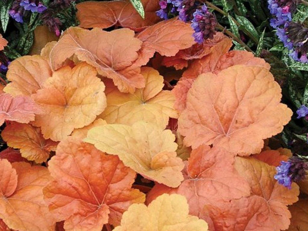 Heuchera 'Southern Comfort' - eine üppig wachsende Sorte der Heuchera, die einen kompakten Horst bildet und eine Höhe von 60 cm erreicht. Sie trägt große, flach gelappte Blätter mit fein gezackten Rändern, die eine auffällige zimtfarbene Färbung aufweisen und später in ein dunkles Kupfer übergehen. Schöne und gesunde Blätter halten auch Minustemperaturen stand. Ihre Färbung variiert je nach Standort, wobei sie im Schatten weniger intensiv ist und im Halbschatten intensivere Farben annimmt. Ab Ende Mai blüht sie reichlich mit cremefarbenen Blüten, die in aufrechten Rispen an dünnen Stielen wachsen. Ideal für jeden Garten und auch für die Kultivierung in Behältern geeignet.