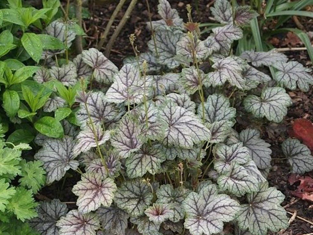 Heuchera 'Venus' - Immergrüne Staude, die bis zu 40 cm hoch wird. Rosa Blüten erscheinen von Juni bis August. Die Blätter sind herzförmig, flach und haben gezackte Ränder. Große, glänzende Blätter haben eine grüne Farbe mit einem Hauch von Silber. Die Blattfarbe hängt vom Standort ab. Geeignet für die Pflanzung in Gruppen oder als Einfassung und zum Schnitt.