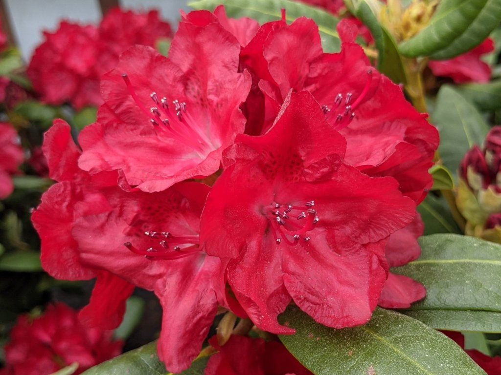 Rhododendron 'Busuki' - ein dicht wachsender, immergrüner, kompakter Strauch mit breiter, kugelförmiger Gestalt, der unter geeigneten Bedingungen eine Höhe von etwa 110 cm und eine Breite von etwa 140 cm erreicht. Er zeichnet sich durch eine reiche späte Blüte an der Wende von Mai und Juni aus, wenn er buchstäblich mit zahlreichen glockenförmigen Blüten in kugelförmigen Blütenständen bedeckt ist. Ihre rein rote Färbung mit einem zart weißlichen Zentrum bildet einen deutlichen Kontrast und macht den Strauch unübersehbar. Dunkelgrüne, ledrige und längliche Blätter unterstreichen sein dekoratives Aussehen das ganze Jahr über. Dieser Kultivar kommt als Solitärpflanze zuverlässig zur Geltung, ist aber dank seines kompakten, harmonischen Habitus auch ideal für die Gruppenbepflanzung, wo er der Komposition Farbdynamik und stabile Struktur verleiht.
