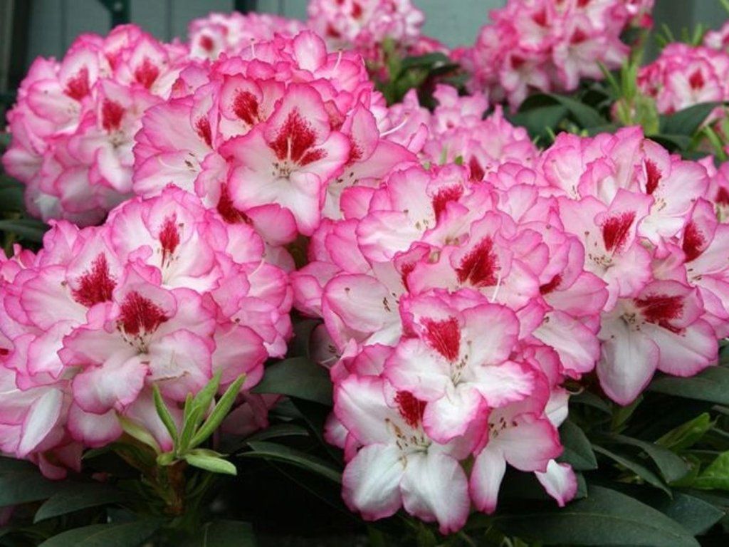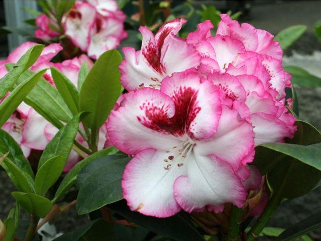 Rododendron 'Cherry Cheesecake' - immergrüner Strauch aus der Gattung der Rhododendren, der durch seine auffälligen Blüten und seinen kompakten Wuchs besticht. Im ausgewachsenen Zustand erreicht er normalerweise eine Höhe und Breite von etwa 1,2 bis 1,5 Metern, unter idealen Bedingungen kann er auch größer werden. Die Blüten erscheinen im Frühling, meist im Mai, und bilden kugelförmige Blütenstände. Die Blütenblätter sind schneeweiß mit einer ausgeprägten rosa-roten Umrandung und einer auffälligen weinroten Zeichnung auf dem oberen Blütenblatt. Diese Kombination verleiht den Blüten einen interessanten Kontrast und einen dekorativen Ausdruck. Die Blätter sind dunkelgrün, glänzend, ledrig und bleiben das ganze Jahr über erhalten. Der Wuchs des Strauchs ist kompakt und dicht, was zu seiner Stabilität und seinem ästhetischen Erscheinungsbild beiträgt. Die Sorte stammt aus der Züchtung von Briggs Nursery, wo sie als verbesserte Form der vorherigen Sorte Rhododendron 'Hachmann's Charmant' entstand. Bei der neuen Sorte wurden die Stängel und Blätter verstärkt und der Wuchs verkürzt, was zu einem festen und kompakten Wachstum führt. Er eignet sich als Solitärpflanze oder als Teil einer Gruppenpflanzung von säureliebenden Sträuchern. Dank seiner kompakten Größe und immergrünen Blätter ist er auch für kleinere und mittlere Gärten geeignet, für den Halbschatten unter höheren Bäumen oder für Kübel.