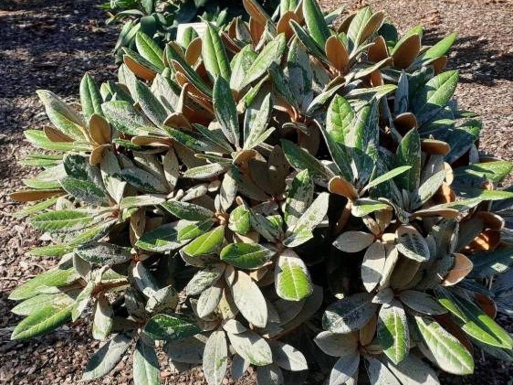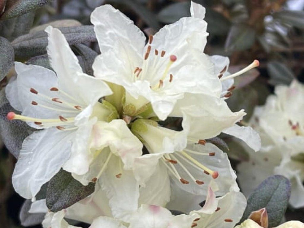 Rhododendron 'Elya' - eine weitere einzigartige Kreuzung aus der beliebten Rhodo Elite Kollektion. Im Gegensatz zu den üppigen, attraktiven Blütenständen bietet er auch ein interessantes, ungewöhnliches Laub. Es handelt sich um eine langsam wachsende Form, die eine Höhe von 50 - 60 cm erreicht und so einen kompakten, ausladenden Strauch bildet. Typische kugelförmige Blütenstände erscheinen im Mai in großer Zahl. Die Blütenblätter sind auffallend gekräuselt, schneeweiß mit kontrastierenden Stempeln. Die Blätter sind steif und länglich. Frisch austreibende Blätter sind intensiv mit zimt- bis cremefarbenem Filz bedeckt, den die Blätter behalten. Dieses Unikat sollte in keiner Gartensammlung eines Rhododendronzüchters fehlen.