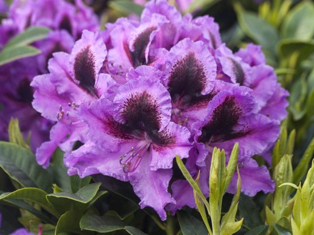 Rhododendron 'Graal Müritz' - ein großblütiger Rhododendron aus deutscher Züchtung, der auf stabiles Wachstum, gute Frosthärte und auffällige Frühlingsfarben der Blüten abzielt. Der Strauch wird etwa 1,3-1,5 m hoch und breit und bildet einen festen, breit-ovalen Habitus. Die Blätter sind immergrün, ledrig, 10-14 cm lang, dunkelgrün und auf der Unterseite leicht heller. Im Frühling kontrastieren sie mit den Blütenständen, die von Mitte Mai bis Anfang Juni erscheinen. Die Blüten sind trichterförmig, 6-7 cm groß, in dichten Blütenbüscheln mit einem Durchmesser von 10-12 cm angeordnet. Sie tragen violette Farbtöne, ergänzt durch eine dunklere purpurne Zeichnung am oberen Lappen. Die Farbverläufe erzeugen einen zarten Effekt, der besonders beim Entfalten der Knospen sichtbar wird. Die Sorte wirkt natürlich und elegant, sie eignet sich sowohl als Solitär als auch als Teil größerer Pflanzungen. Sie kommt neben Farnen, Funkien, Pieris oder Azaleen gut zur Geltung und passt auch gut zu Kultivaren von Rhododendron yakushimanum. Wie alle Rhododendren ist er giftig.