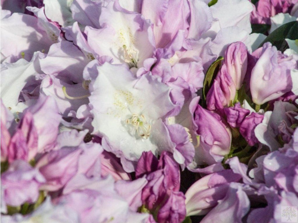 Rhododendron 'Hoppy' - eher langsam wachsender Kultivar des immergrünen Rhododendrons, der einen ordentlichen, kompakten Strauch bildet. Er erreicht eine Höhe von 100 - 200 cm bei ähnlicher Breite, je nach Wachstumsbedingungen. Ende Mai trägt er reiche, kugelförmige Blütenstände von reinweißer Farbe mit einem violetten Schimmer und einer ausgeprägten Zeichnung auf dem oberen Blütenblatt. Die Blüten sind groß, weit geöffnet und am Rand auffallend gewellt. Die immergrünen Blätter sind dunkelgrün und ledrig. Er erfüllt die Rolle einer Solitärpflanze in jedem Garten und ergänzt jede Gruppenbepflanzung hervorragend.