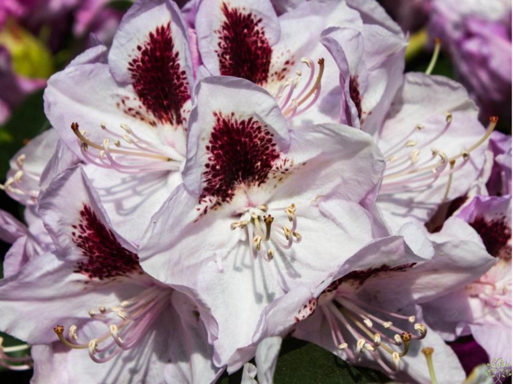 Rhododendron 'Humboldt' - ein mittelwüchsiger Kultivar des immergrünen Rhododendrons, der einen reich verzweigten, ausladenden Strauch bildet. Er erreicht eine Höhe von 120 cm und eine Breite von 160 cm, je nach Kulturbedingungen. Ende Mai trägt er reiche, kugelförmige Blütenstände, die lavendelfarben mit intensiver Zeichnung auf dem oberen Blütenblatt sind. Die Blüten sind groß, weit geöffnet und haben eine glockenförmige Gestalt. Immergrüne Blätter sind eiförmig, ledrig und dunkelgrün. Er erfüllt die Rolle einer Solitärpflanze in jedem Garten und ergänzt jede Gruppenbepflanzung hervorragend.
