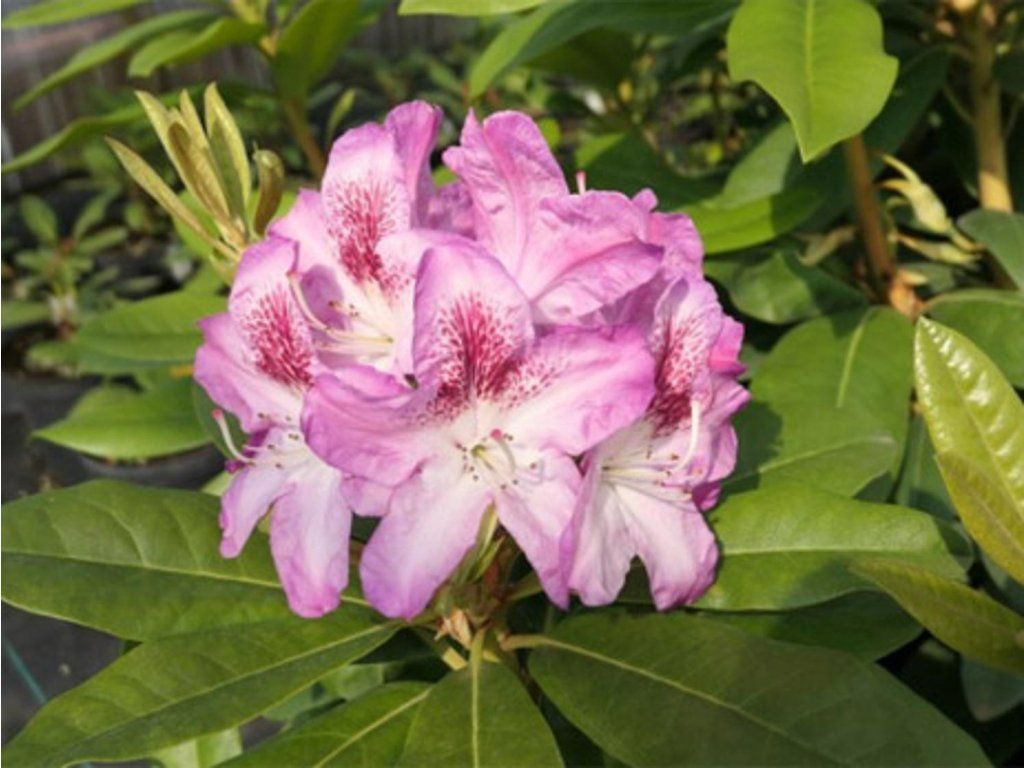 Rhododendron 'Ještěď' - unsere gezüchtete Sorte des immergrünen Rhododendrons, geschätzt für sein energisches Wachstum, seinen festen buschigen Habitus und seine intensiv gefärbten Blüten. Nach tschechischen Züchterangaben bildet er einen aufrechten, leicht ausladenden Strauch, der im ausgewachsenen Zustand etwa 1,4 m hoch und etwa 1,6 m breit wird. Die Blätter sind mittelgrün, elliptisch bis breit oval, ledrig und behalten das ganze Jahr über eine frische Farbe. Ende Mai und Anfang Juni öffnen sich an den Triebspitzen kugelförmige Blütenstände, die aus großen, weit geöffneten, glockenförmigen Blüten bestehen. Ihr Grundton ist hell lavendel-lila bis zart violett, die Mitte ist heller und das obere Blütenblatt wird durch eine ausgeprägte weinrote Zeichnung hervorgehoben, die der Blüte Tiefe und Kontrast verleiht. In voller Blüte wirkt der Strauch weich und feierlich. Die Sorte eignet sich als Solitärpflanze im halbschattigen Vorgartenbereich, in Gruppenpflanzungen mit anderen Rhododendren sowie in Kompositionen mit Pieris, Farnen, Funkien oder niedrigen japanischen Ahornen. Dank seines tschechischen Ursprungs ist er auch für Sammler interessant, insbesondere dort, wo die Kombination aus heimischer Züchtung und klassischem großblütigem Effekt erwünscht ist.