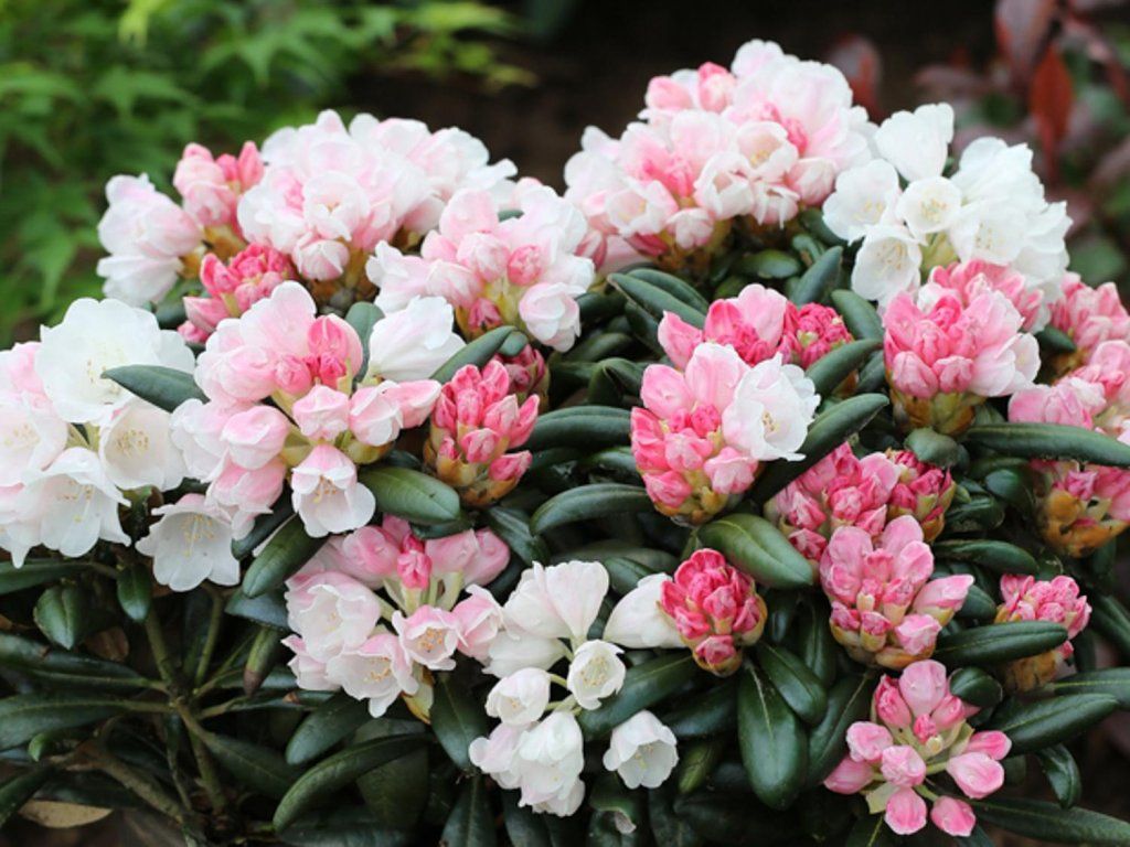 Rhododendron 'Koichiro Wada' - langsam wachsender, immergrüner Strauch mit kompaktem Wuchs. Die Höhe in der Reife beträgt etwa 80 cm und die Breite 100 cm, je nach Kultivierungsbedingungen. Die Blütenrispen sind leicht überhängend und haben eine weiß-rosa Färbung. Sie blühen im Mai oder Anfang Juni in großer Zahl. Die Blätter sind tiefgrün und bilden einen hervorragenden Kontrast zu den hell gefärbten Blüten. Dieser Kultivar erfüllt zuverlässig die Rolle eines Solitärgehölzes, sieht aber auch als Teil einer Gruppenkomposition großartig aus.