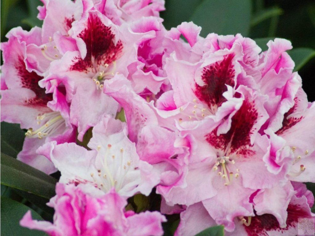 Rhododendron 'Królowa Jadwiga/Royal Butterfly' - immergrüner, üppig wachsender Strauch mit kompakter Form. Er erreicht eine Höhe von 180-200 cm unter geeigneten Wachstumsbedingungen. Die glockenförmigen Blüten erscheinen im Mai, können aber auch im Herbst erneut blühen. Dies ist eine reich blühende Sorte, deren Blütenstand in kugelförmigen Büscheln angeordnet ist. Die Knospen sind tiefrosa und nach vollständiger Entfaltung sind die gerüschten Blütenblätter romantisch rosa mit einem deutlichen weinroten Fleck auf dem oberen Blütenblatt. Die Blätter sind lang, schmal und mittelgrün. Er erfüllt die Rolle einer Solitärpflanze in jedem Garten und ist ideal für Gruppenpflanzungen.