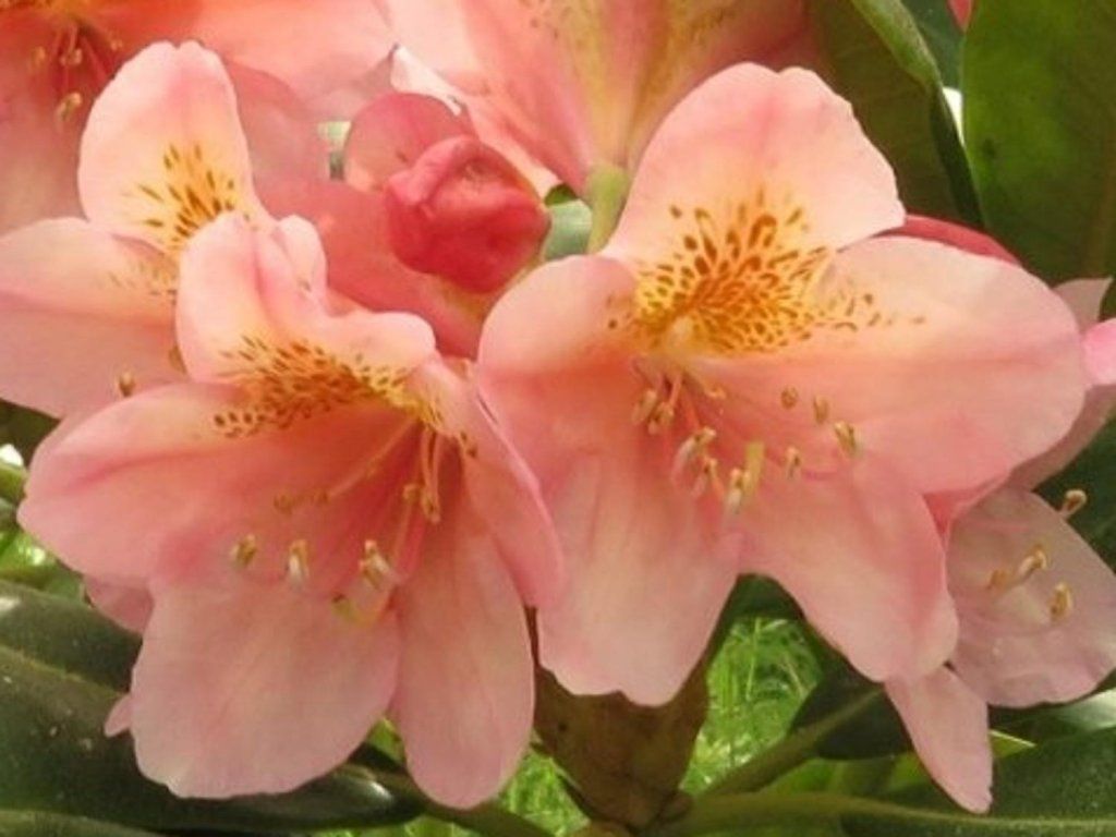 Rododendron 'Merja' - Knospen sind rot, die Blüten sind dann rosafarben-orange mit gelbbraunen Flecken. Das Wachstum ist dicht und die Blätter sind dunkelgrün, größer. Sie hat einen kompakten Wuchs. Mit 10 Jahren erreicht er eine Höhe von ca. 80 cm. Die Blüten erscheinen im Mai. Die Frostbeständigkeit beträgt nicht weniger als -30 ° C. Er sieht gut aus als Solitärstrauch, in Kombination mit anderen Sorten, aber auch mit Thujen, die ausreichend Schatten für Rhododendren spenden.