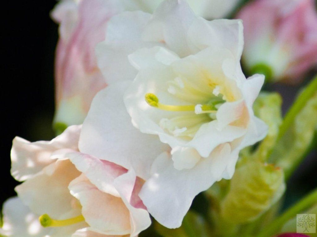 Rododendron 'Nikodemus' - immergrüner kompakter Strauch, es handelt sich um eine Zwergsorte mit breiter, kugelförmiger Gestalt. Unter geeigneten Kulturbedingungen kann er eine Höhe von 50 cm und eine Breite von 100 cm erreichen. Blüht sehr reichlich ab Mitte Mai. Dekorative, glockenförmige Blütenstände haben eine weiße Farbe mit rosafarbenen Tönen. Die Blätter sind breit elliptisch mit einer spitzen Spitze, haben eine tiefgrüne, matte Farbe und sind leicht gebogen. Er erfüllt die Rolle einer Solitärpflanze in jedem Garten und ist ideal für Gruppenpflanzungen.