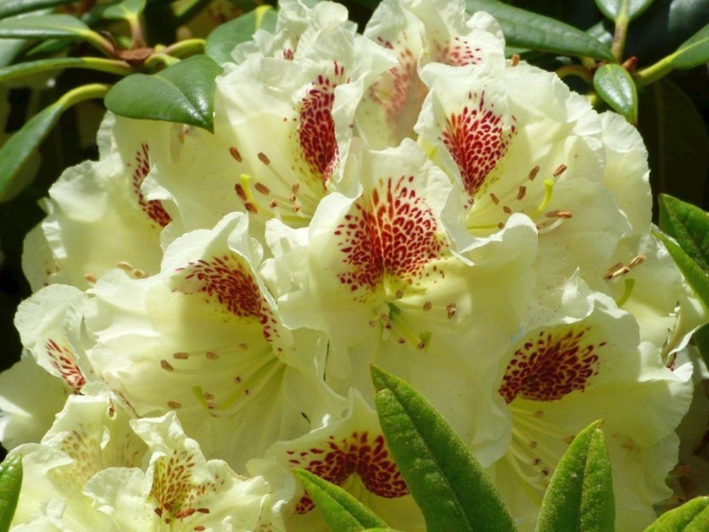 Rododendron 'Orlík' - mittelgroßer, immergrüner Strauch mit aufrecht kugelförmigem bis leicht ausladendem Wuchs. Im Laufe von zehn Jahren erreicht er eine Höhe von 1,2 m und eine Breite von 1,5 m. Blüht von Anfang bis Ende Mai. Die Blüten sind hellgelb gefärbt, aber mit ausgeprägten dunkelbraun-roten Flecken. Die Blätter sind breit elliptisch mit einer spitzen Spitze, haben eine tiefgrüne, matte Farbe und sind leicht gebogen. Er erfüllt die Rolle einer Solitärpflanze in jedem Garten und ist ideal für Gruppenpflanzungen.