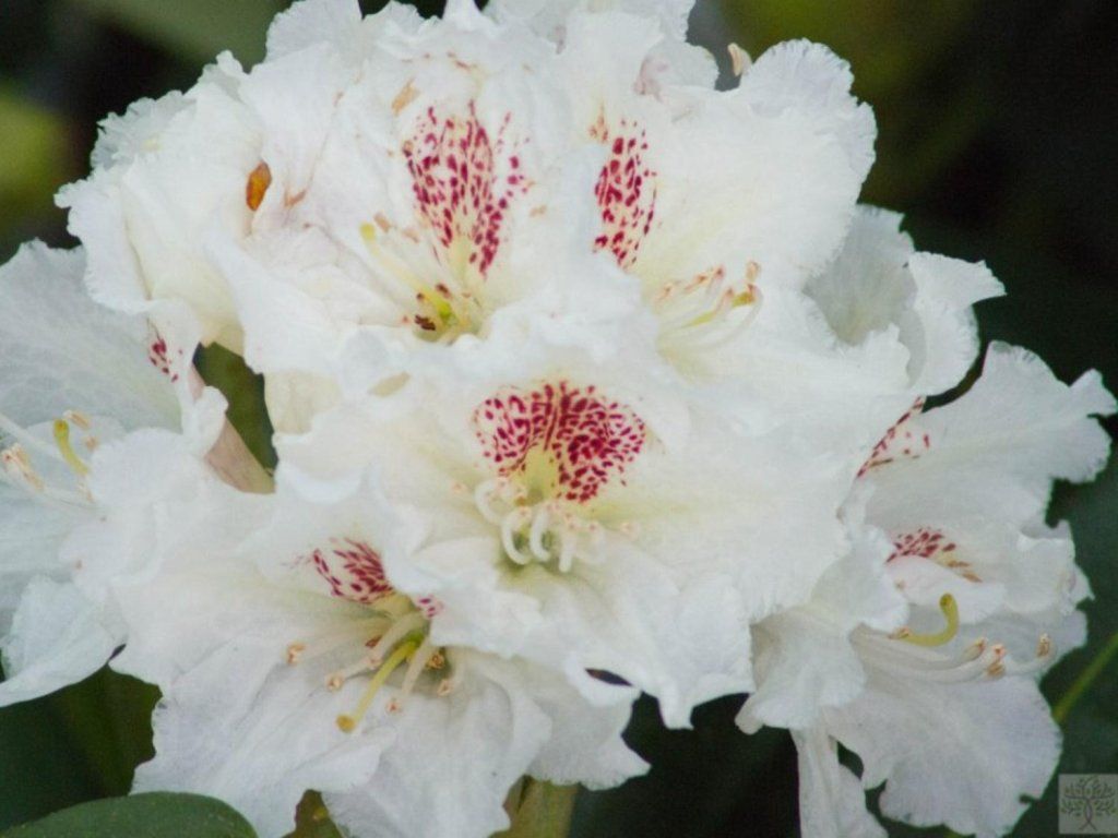 Rhododendron 'P.M.A. Tigerstedt' - eine Sorte, die aus der Kreuzung der Sorten Catawba und Mustila entstanden ist. Die Blütenblätter sind weiß und das obere Blütenblatt hat dunkelviolette Flecken. Sie erscheinen im Juni und halten 3 - 4 Wochen. Die Sorte ist sehr widerstandsfähig und passt sich gut an verschiedene Bedingungen an. Nach zehn Jahren erreicht sie eine Höhe von etwa 1,5 Metern.