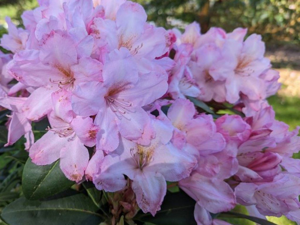 Rhododendron 'Paola' - ein mittelwüchsiger Kultivar, erreicht eine Höhe von 1,3 – 1,5 m und eine Breite von etwa 1,5 – 1,8 m, abhängig von den Kulturbedingungen. Etwa in der zweiten Maihälfte beginnen sich zartrosa Blüten auf der Pflanze zu zeigen, das obere Blütenblatt weist eine typische braunrote Punktierung auf. Die Ränder der Blütenblätter sind leicht gewellt. Die Schönheit von Rhododendren wird stets durch ihre ledrigen, dunkelgrünen und leicht glänzenden Blätter unterstrichen. Rhododendren sind eine geeignete Solitärpflanze, aber in einer Gruppenpflanzung gehen sie dank ihrer Blüten keineswegs unter.