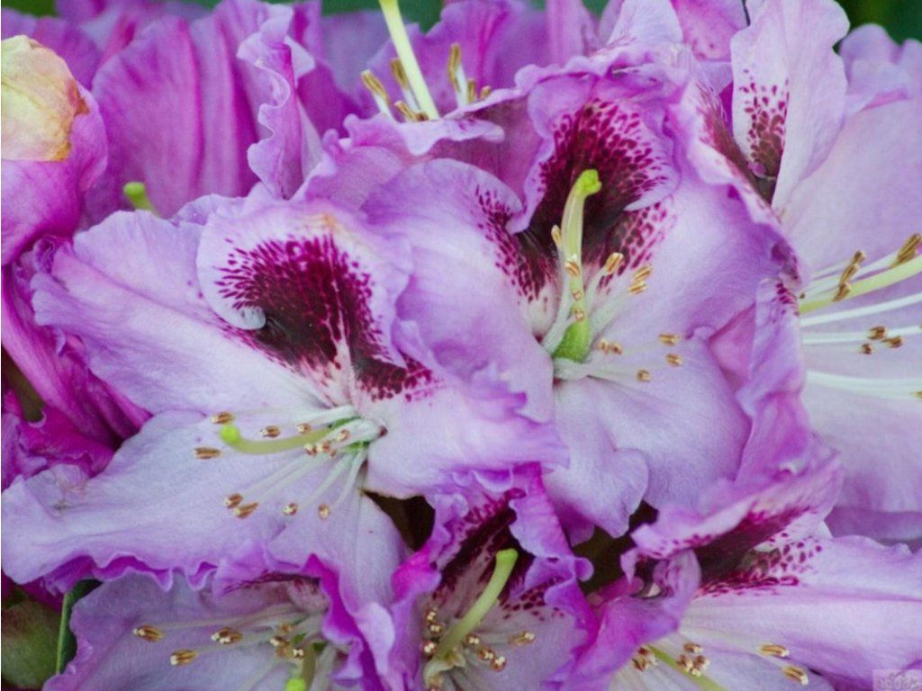 Rhododendron 'Pfauenauge' - eine neu gezüchtete Sorte des immergrünen Rhododendrons, die einen flachkugelförmigen, kompakten Strauch bildet. Er erreicht eine Höhe von 120 cm und eine Breite von 150 cm. Er blüht später, an der Wende von Mai und Juni. Große, weit geöffnete Blüten sind lila - rosa mit einem kontrastierenden weißlichen Zentrum und einer ausgeprägten bordeauxroten Zeichnung. Die Blätter sind länglich und dunkelgrün. Er erfüllt die Rolle einer Solitärpflanze in jedem Garten und ergänzt jede Gruppenbepflanzung hervorragend.