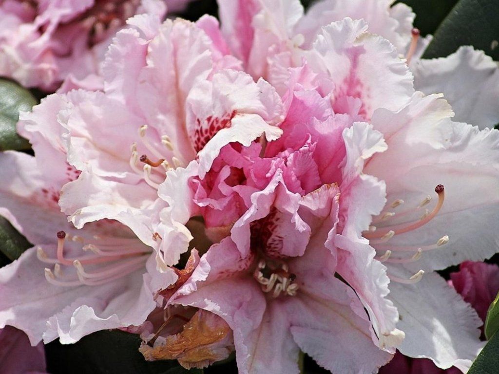 Rhododendron 'Progres' - eine Sorte mit großen weißen Blüten mit einem rosafarbenen Hauch und einem violetten Fleck in der Mitte. Ihre Ränder sind gewellt. Sie blühen im Mai. Er erreicht eine Höhe von 1,3 m und eine Breite von 1,6 m. Frostbeständig bis -22°C.