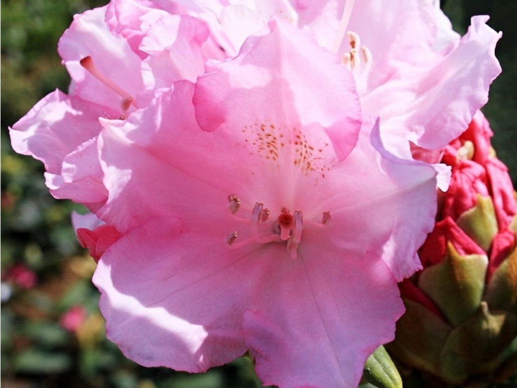 Pflege: Alle Rhododendronarten werden in leichte, nährstoffreiche und vor allem saure Erde (pH 4-5) gepflanzt. Ideal ist eine Mischung aus Substrat, Sand und Torf. Die Erde wird ständig feucht gehalten, sollte aber dennoch gut durchlässig sein. Es ist ratsam, Rhododendren dauerhaft gemulcht zu halten. Sträucher wurzeln flach, daher pflanzt man sie nicht zu tief. Wir wählen einen eher halbschattigen, ausreichend hellen Standort (im zu starken Schatten blühen sie weniger, direkte Sonne kann die Blätter verbrennen) ohne starke Zugluft.