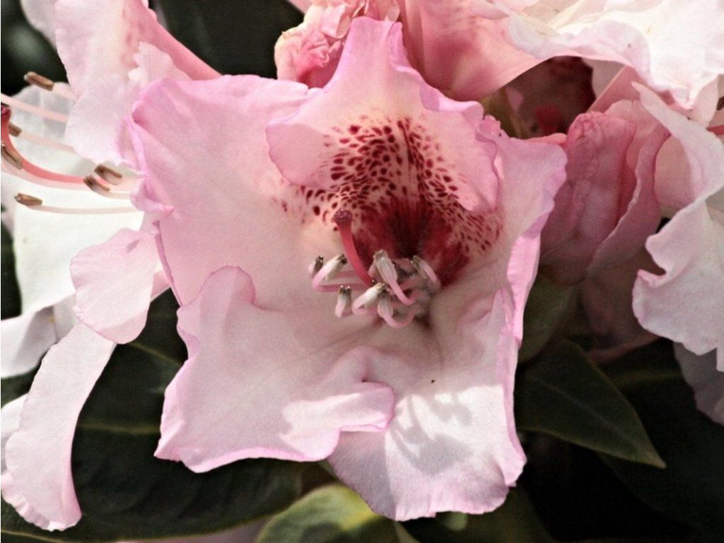 Rhododendron 'Simona' - eine Sorte mit cremefarbenen Blüten, mit weinroten Flecken. Die Blütenränder haben einen leichten rosa-violetten Schimmer und sind leicht gewellt. Von unten sind sie dagegen deutlich rosafarbener. Erreicht eine Höhe von 1,6 m.