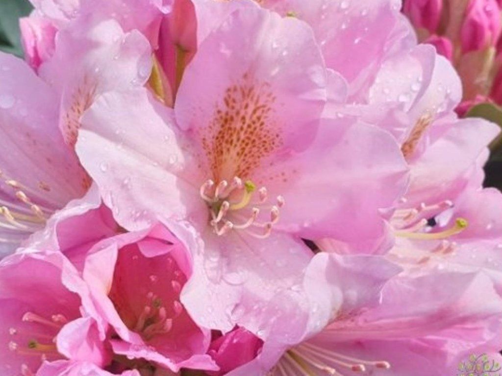 Rhododendron 'Tomasz Wojciech' - kräftig wachsender, aufrechter Strauch, der innerhalb von fünfzehn Jahren eine Höhe von 1,5-2 m und eine ähnliche Breite erreicht. Lanzettförmige Blätter sind dunkelgrün, leicht glänzend. Attraktive Blüten haben einen Durchmesser von 6-8cm. Sie haben eine zarte, romantisch-rosa Farbe und einen ausgeprägten olivbraunen Fleck auf dem oberen Blütenblatt. Blüht reichlich ab Mitte Mai. Frostbeständigkeit bis -23°C.