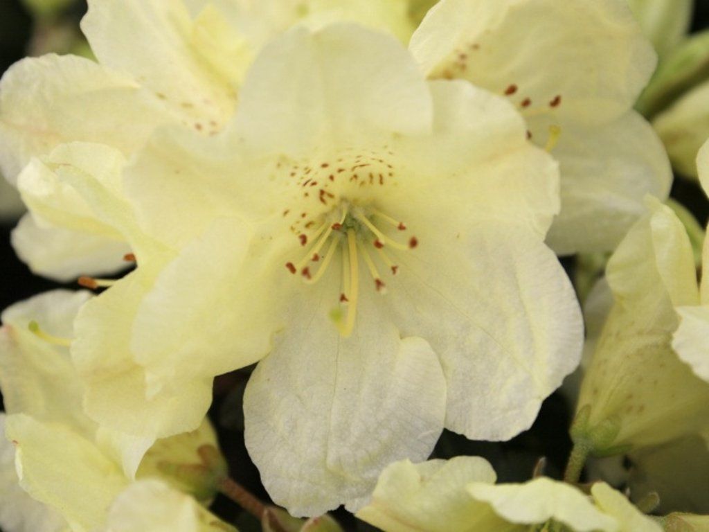Rhododendron 'Wren' - gehört zu den Zwergkultivaren, die von der Art Rhododendron keiskei abstammen, welche ursprünglich aus den Bergregionen Japans stammt. In seiner natürlichen Umgebung wächst er in humosen, leichten Böden unter dem gestreuten Licht von Nadelwäldern. Der Kultivar 'Wren', gezüchtet für seinen kompakten Habitus und seine frühe Blüte, bildet dichte, niedrige Polster mit einer Höhe von etwa 30-50 cm und einer Breite von 50-100 cm. Seine Blätter sind klein, elliptisch, tiefgrün, immergrün und behalten ihre Struktur auch in den Wintermonaten gut bei. Die Blüten erscheinen bereits im April und blühen bis in den Mai hinein. Sie sind weitglockig, 3-4 cm groß, cremegelb bis hellbuttergelb, manchmal mit einem zarten grünlichen Schimmer im Schlund. Die Blüten sind in kleineren Trugdolden angeordnet, die besonders in Kombination mit dunklerem Laub hervorstechen. Die frühe Blüte macht ihn zu einem geeigneten Element für Kompositionen, bei denen es darum geht, die Frühlingssaison zu verlängern. Die Pflanze findet Anwendung in Steingärten, auf Heideflächen, zwischen Zwergkoniferen oder als Topfsolitär auf geschützten Terrassen. Sie lässt sich gut mit kleinen Kultivaren von Pieris japonica, niedrigen Kiefern und Frühlingszwiebelblumen kombinieren.