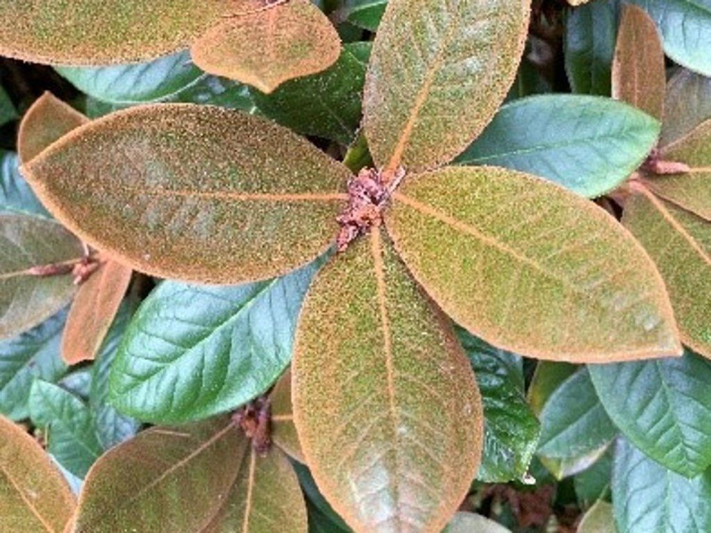 Bтуреavii-Rhododendron 'Robin' - attraktiver, immergrüner Moorbeet-Strauch mit auffälliger Zierlaub und kompaktem Wuchs. Er stammt aus den Bergregionen Chinas, wo er in höheren Lagen wächst und in der Kultivierung nicht nur für seine Blüten, sondern vor allem für die interessante Farbe und Struktur der Blätter geschätzt wird. Diese Sorte erreicht eine Höhe von etwa 1 bis 1,5 Metern und hat einen kompakten, dichten Habitus. Die Blätter sind elliptisch, dunkelgrün, glänzend und auf der Unterseite mit einem dichten rostbraunen, filzigen Belag (Indument) bedeckt, der für die Art Rhododendron bureavii typisch ist. Dieser Kontrast zwischen dem satten Grün der Oberseite und der rostigen Unterseite verleiht dem Strauch das ganze Jahr über eine ausgeprägte Zierwirkung.