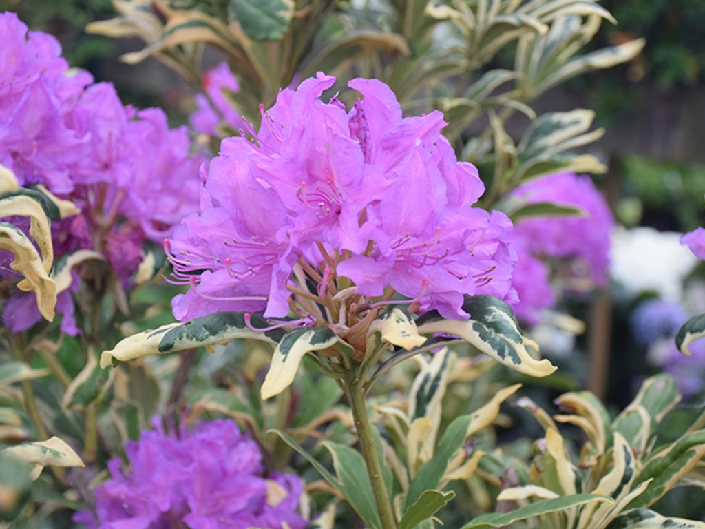 Rhododendron/Alpenrose 'Variegatum' - ein immergrüner Kultivar der Schwarzmeer-Rose aus der Familie der Heidekrautgewächse (Ericaceae). Die Ursprungsart Rhododendron ponticum stammt aus der Kaukasusregion und Nordtürkei, wo sie in feuchten Bergwäldern auf sauren Böden wächst. Der Kultivar 'Variegatum' ist bereits seit dem 19. Jahrhundert bekannt und wird hauptsächlich wegen seines dekorativen, panaschierten Laubes angebaut. Die Blätter sind ledrig, elliptisch, glänzend und dunkelgrün, mit einem unregelmäßigen cremeweißen bis hellgelben Rand. Dank dieses Kontrasts bleibt der Strauch das ganze Jahr über auffällig. Von Mai bis Anfang Juni erscheinen an den Triebspitzen traubenförmige Blütenstände aus trichterförmigen Blüten in einem violetten Farbton. Die einzelnen Blüten haben eine zart gefleckte Innenseite und sind für bestäubende Insekten attraktiv. Der Strauch wächst mittelschnell und erreicht im ausgewachsenen Zustand in der Regel eine Höhe von etwa 1,5–2 m und eine ähnliche Breite. Dank seines auffälligen Laubes wird er oft als Solitärpflanze oder in Gruppen mit anderen Moorbeetpflanzen gepflanzt, wo er eine kontrastreiche Struktur zwischen dunkelgrünen Blättern und dem hell geränderten Rand bildet.