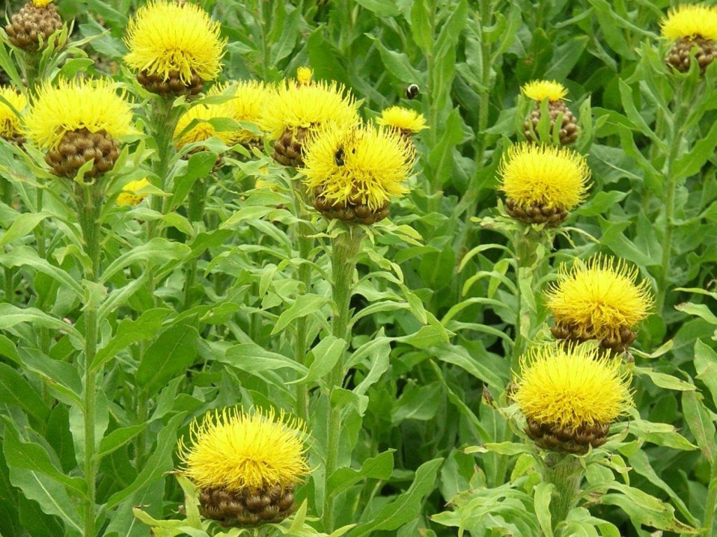 Großköpfige Flockenblume - stammt aus den Bergwiesen des Kaukasus und der nordöstlichen Türkei, oft aus dem Gürtel nahe der oberen Waldgrenze. Im Garten bildet sie einen ausgeprägten, horstigen Habitus mit aufrechten Stängeln und einer reichen grundständigen Rosette. Die Blätter sind breit lanzettlich, leicht rau, graugrün bis mittelgrün, die untersten sind gestielt und können etwa 20–25 cm erreichen, weiter oben am Stängel sitzen sie anliegend. An den Enden der steifen, fein behaarten Stängel öffnen sich im Juli und August kugelförmige Körbchen von 7–10 cm. Die Blüten haben einen tiefgelben Farbton, die Randblüten sind länger und verleihen dem Körbchen eine „flauschige“ Kontur. Die Hüllblätter sind glänzend, hellbraun und erinnern an Artischocken, sodass auch verwelkte Blütenköpfe dekorativ wirken. Die Pflanze eignet sich als Akzent in einem Staudenbeet sowie in naturnahen Pflanzungen und zieht Bestäuber an. Sie lässt sich gut mit Ziergräsern, Rudbeckien, Salbei oder Fetthennen kombinieren, die später im Sommer nachblühen. Die Blüten eignen sich zum Schnitt und behalten nach dem Trocknen lange ihre Form.