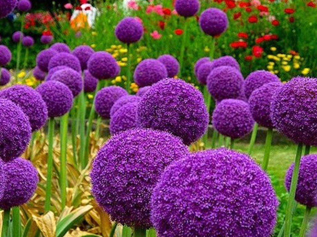 Knoblauch Riesen - Seine Zwiebeln werden im Herbst etwa 10-15 cm tief gepflanzt und mit Erde bedeckt. Er erreicht eine Höhe von 150 cm. Anspruchslose Knoblauchart. Blüht in dichten, kugelförmigen Köpfen von tiefvioletter Farbe mit einer Größe von 10 cm. Muss an einem sonnigen oder halbschattigen Standort stehen, der Boden sollte leicht und kalkhaltig sein. Im Winter wird eine leichte Abdeckung aus Zweigen oder Blättern empfohlen. Der Blütenstand eignet sich zum Trocknen und für Blumenarrangements. Sie blüht von Juni bis August.
