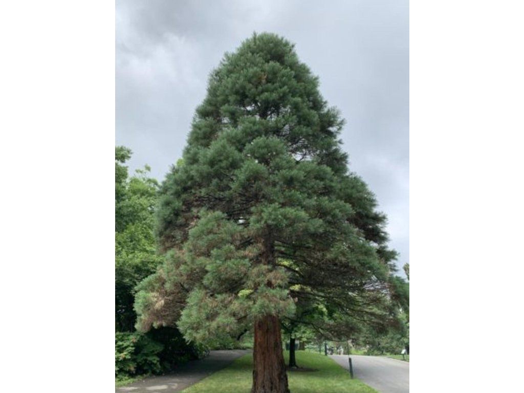 Riesen-Mammutbaum - ein massiver Nadelbaum mit einer charakteristischen kegelförmigen Krone und dichtem blaugrünem Nadelwerk. Diese Art ist immergrün und erreicht eine Höhe von 25–50 m und eine Breite von 4–8 m, in seiner natürlichen Umgebung in den USA kann er noch höher werden. Die Nadeln sind kurz, spiralförmig an den Ästen angeordnet und behalten das ganze Jahr über ihre Farbe. Der Mammutbaum produziert keine Blüten, seine Fortpflanzungsorgane sind Zapfen von 4–7 cm Länge, die etwa 18–20 Monate reifen und oft lange geschlossen bleiben, bis warme Luft oder Hitze sie öffnet. Ursprünglich stammt er aus den Hängen der Sierra Nevada in Kalifornien, wo er tausende von Jahren alt wird und seine Rinde dick, faserig und rotbraun ist und vor Feuer schützen kann. Die Samen sind klein, dunkelbraun mit einem geflügelten Rand. Der Mammutbaum ist bis ca. ‑29 °C frostbeständig, was ihn in unseren Lagen als Dominante für große Gärten und Parks nutzbar macht, jedoch wegen seiner Größe nicht für kleinere Gärten. Dieser Nadelbaum wird zu einem wahren Prunkstück für jeden weitläufigen Garten.