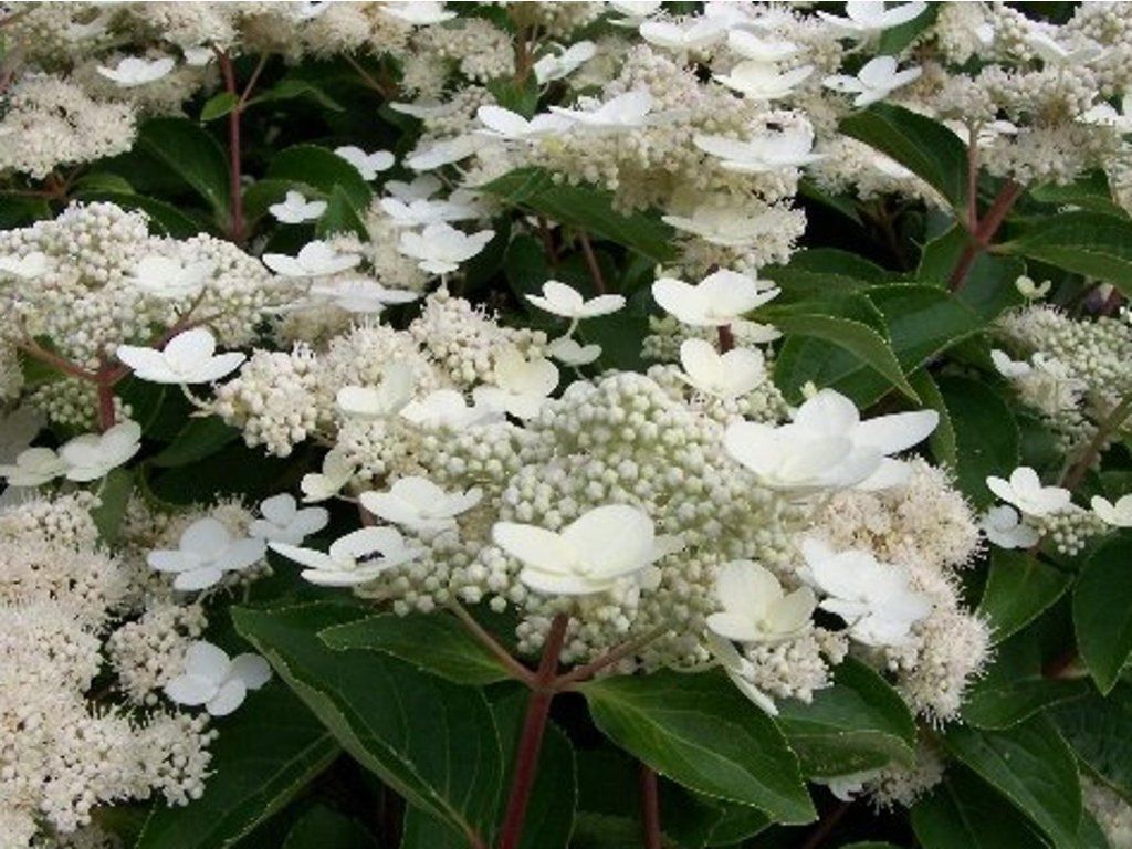Anbau: Rispenhortensien sind in unseren Gärten sehr beliebt wegen ihrer Anspruchslosigkeit und hohen Frostbeständigkeit, die bis zu –30 °C reicht. Im Gegensatz zu anderen Arten blühen sie an neuem Holz, was bedeutet, dass Frost ihnen im Winter ihre Blüten nicht nimmt. Sie gedeihen am besten an einem sonnigen Standort, wo sie am intensivsten blühen, vertragen aber problemlos auch Halbschatten. Hinsichtlich des Bodens sind Rispenhortensien sehr anpassungsfähig und benötigen kein ausgesprochen saures Substrat; sie gedeihen am besten in leicht saurer bis neutraler, humoser Erde, die Feuchtigkeit gut speichert, aber nicht dauerhaft vernässt ist. Im Gegensatz zu Bauernhortensien beeinflusst der pH-Wert hier die Blütenfarbe nicht. Diese ändert sich natürlich mit dem Alter der Blüte und dem Absinken der Temperaturen, wobei der endgültige Farbton von der jeweiligen Sorte abhängt. Während einige Sorten bis zum Herbst schneeweiß oder limettengrün bleiben, färben sich andere zartrosa und wieder andere, wie zum Beispiel 'Vanilla Fraise' oder 'Wim's Red', gehen in tief weinrote Töne über. Ausreichende Feuchtigkeit ist entscheidend, daher ist eine regelmäßige und ausgiebige Bewässerung erforderlich, insbesondere in den Sommermonaten, wobei der Boden zwischen den Wassergaben nur leicht antrocknen sollte. Idealerweise sollte die Oberfläche um die Sträucher herum mit Rinde oder Hackschnitzeln gemulcht werden, was die Wurzeln vor Überhitzung schützt und die Verdunstung reduziert. Gedüngt wird vom Frühjahr bis Mitte Sommer mit Düngemitteln für blühende Gehölze oder Kompost, aber ab August wird die Stickstoffzufuhr reduziert, damit die Triebe bis zum Winter verholzen können. Grundlegend für den Erfolg ist ein tiefer Frühlingsschnitt, der im Vorfrühling durchgeführt wird, normalerweise Ende Februar oder im März, wobei die letztjährigen Triebe auf zwei bis drei Knospenpaare gekürzt werden. Dies sorgt für einen dichten Strauch, feste Stiele und große Blütenstände. Beim Anbau in Behältern ist es notwendig, ausreichend große Töpfe mit Abfluss und hochwertige, humose Erde zu wählen, wobei es ratsam ist, den Behälter für den Winter zu isolieren. Zur Vorbeugung gegen Krankheiten und Schädlinge sind vor allem ein luftiger Standort und eine Bewässerung, die direkt auf die Wurzeln und nicht auf die Blätter gerichtet ist, wichtig.