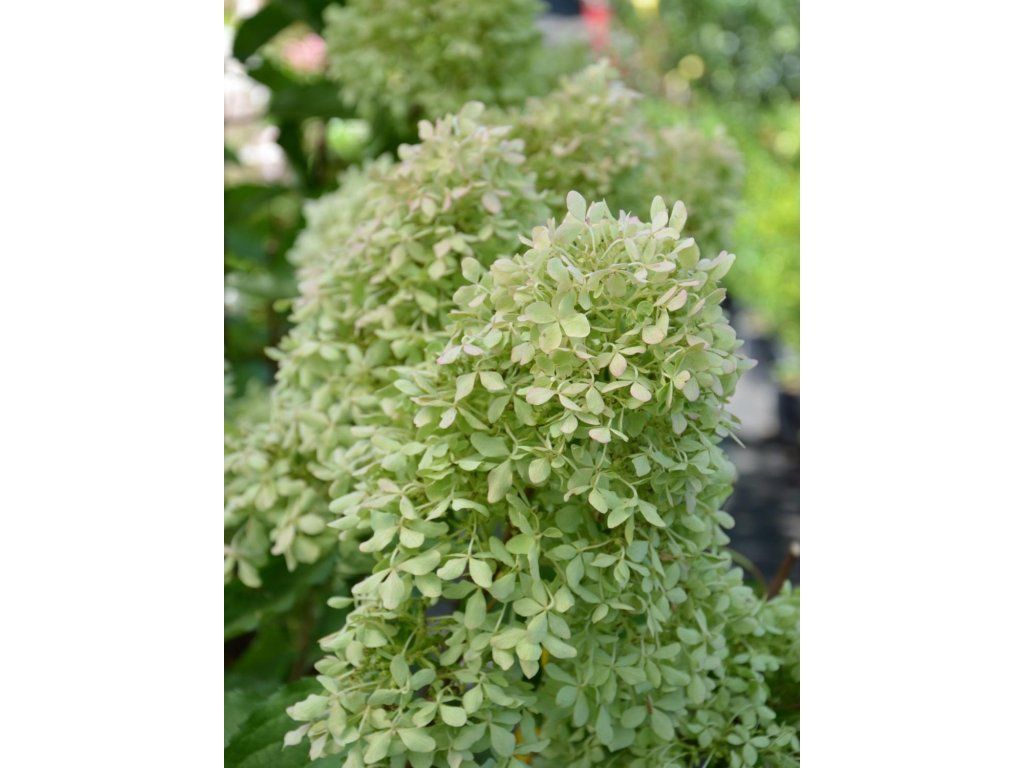 Rispenhortensie 'Magical Lime Sparkle®' - eine neu gezüchtete, niedrigere Sorte der beliebten Hortensie, die nur 80 cm hoch wird und so einen ordentlichen, kompakten und reich blühenden Strauch bildet. Von Juli bis September tragen die aufrechten Triebe voluminöse Rispen sternförmiger Blüten in cremefarben-grüner Farbe, die sich im Laufe der Saison rosa verfärben. Kontrastierende, dunkelgrüne Blätter sind oval mit einer ausgeprägten Spitze. Diese Sorte ist eine gute Wahl für den Rand von Beeten, für Gruppenpflanzungen oder für die Kultur im Topf.