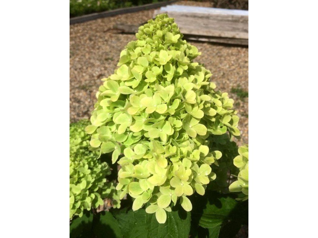Rispenhortensie 'Mojito®' - eine Hortensiensorte mit eher niedrigem, aber breiterem Wuchs, die etwa 0,8–1 m hoch und 1–1,3 m breit wird. Der Strauch ist von der Basis her dicht verzweigt, die Blätter sind elliptisch, tiefgrün und bilden während der Saison eine feste Kulisse für auffällige Blütenrispen. Die Rispen sind groß, kegelförmig, oft 20–25 cm lang, anfangs deutlich limettengrün, später hellen sie zu Grün-Weiß auf und bekommen Ende des Sommers einen zarten Rosaton. Die Blüte erfolgt an diesjährigen Trieben, sodass sie auch nach einem kräftigen Frühjahrsschnitt zuverlässig ist. Die Kombination aus frischen Grüntönen und allmählicher Rosafärbung verleiht den Pflanzungen von Juli bis September Lebendigkeit, manchmal bis zu den ersten Herbstfrösten. Die Sorte eignet sich als niedriger Solitär, in Vorgärten, in Randbepflanzungen entlang von Wegen und in lockeren Gruppen, wo sie gut an höhere Sträucher und Gräser anschließt. Die Blüten eignen sich zum Schnitt und zum Trocknen, ihre Farbe kommt besonders in Kombination mit weißen und blauvioletten Stauden zur Geltung.