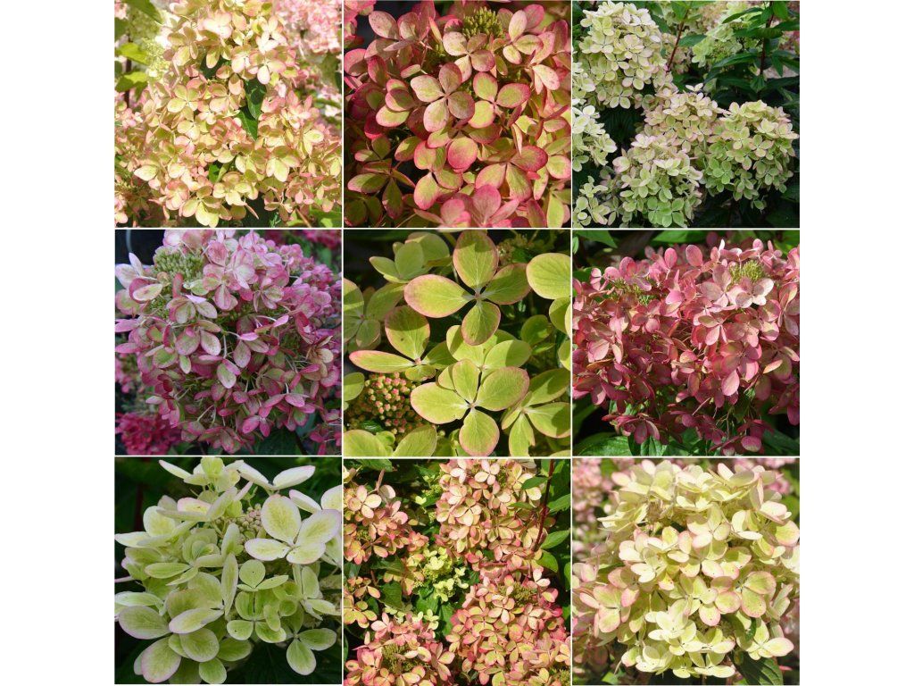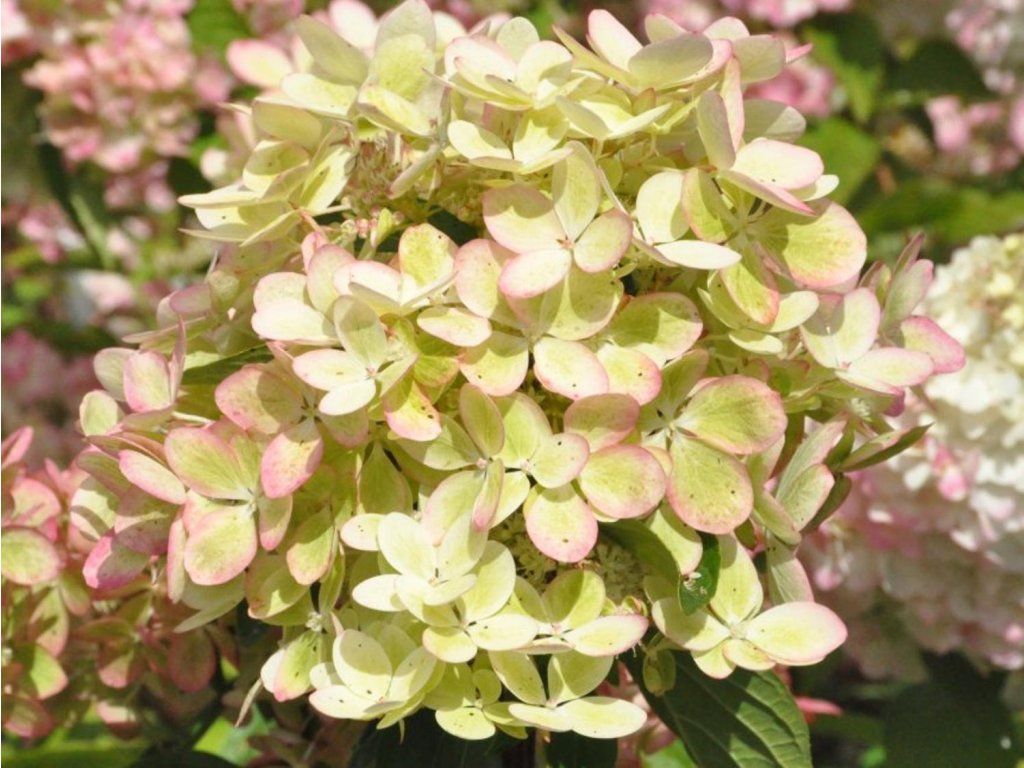 Rispenhortensie 'PastelGreen' - ein faszinierender und absolut einzigartiger Kultivar, der sich von anderen Rispenhortensien durch sein ungewöhnliches Farbspiel, das an eine Malerpalette erinnert, unterscheidet. Sie wächst sehr ordentlich und kompakt und erreicht im ausgewachsenen Zustand eine Höhe und Breite von etwa 1 bis 1,2 Metern. Die Blätter sind tiefgrün und bilden einen dichten Strauch mit festen, aufrechten Stielen. Dieser Kultivar blüht von Juli bis September, und seine Blütenstände sind für ihre Veränderlichkeit berühmt. Während der Saison wechseln sich innerhalb eines Blütenstandes mehrere Farbtöne ab – vom anfänglichen Limettengrün über Cremeweiß und Weiß bis hin zu Zartrosa und Altrosa. All diese Farben treten oft gleichzeitig auf, was einen zarten Pastelleffekt erzeugt, der sehr harmonisch und neuartig wirkt. Die Pflanze ist voll frostbeständig und blüht am diesjährigen Holz, sodass ein tieferer Frühlingsschnitt für die Festigkeit des Strauches und die Fülle der Blüten sorgt. Im Garten ist dieser Kultivar die ideale Wahl für diejenigen, die etwas Originelles für die Vorderseite von Beeten oder für Ziergefäße suchen.