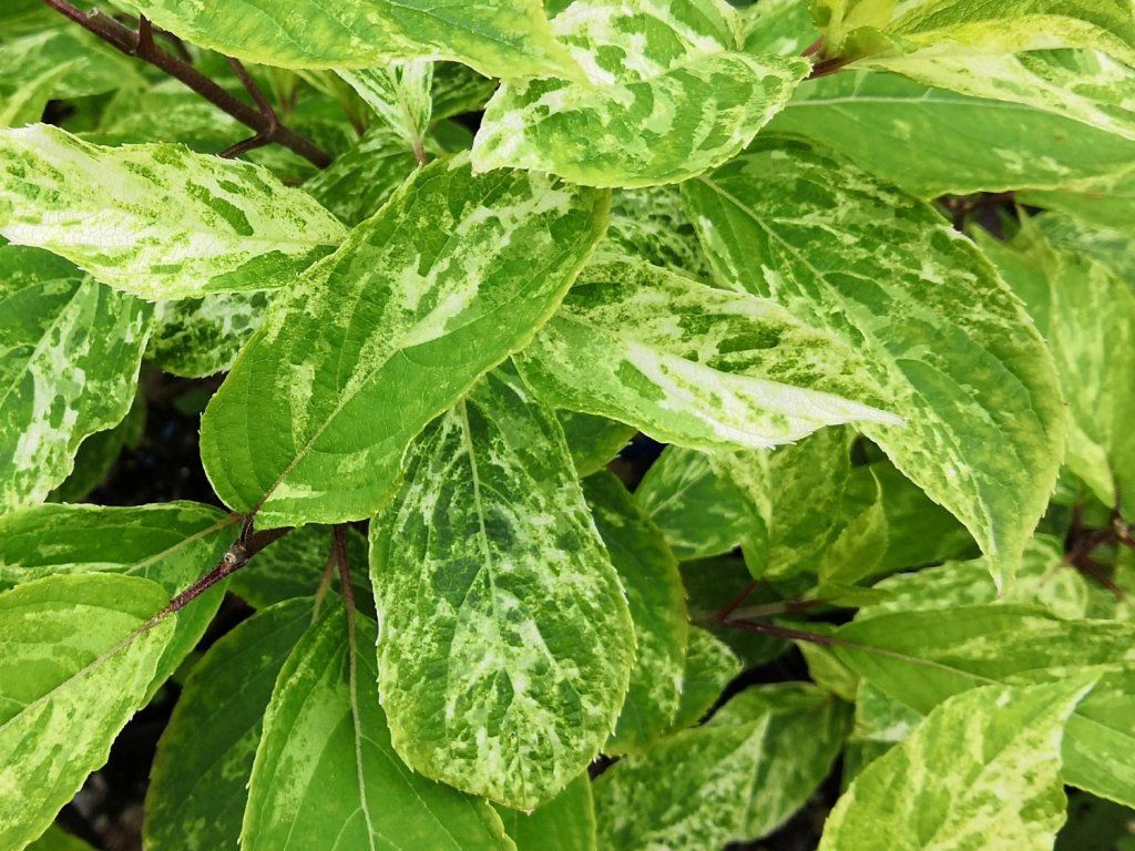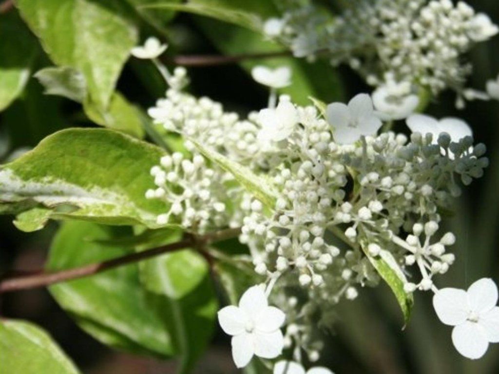 Rispenhortensie 'Shikoku Flash' – eine seltene und sehr attraktive Sorte, die sich von anderen durch ihr wechselndes Laub unterscheidet. Wächst aufrecht und erreicht im ausgewachsenen Zustand eine Höhe und Breite von etwa 1,5 bis 2 Metern. Sein Hauptvorteil sind die Blätter, die ab dem Frühjahr unregelmäßig mit Weiß- oder Cremefarben besprenkelt sind, was dem Strauch auch vor der Blüte ein helles, kontrastreiches Aussehen verleiht. Diese Sorte blüht von Juli bis September und bildet luftige, kegelförmige Blütenstände, die hauptsächlich aus kleinen, fruchtbaren Blüten mit einem geringeren Anteil größerer, steriler Blüten bestehen. Die Blüten sind anfangs reinweiß und erhalten später einen zarten rosafarbenen Schimmer. Die Stiele sind fest und tragen das Gewicht der Blütenstände gut. Die Pflanze ist voll frosthart und blüht am diesjährigen Holz, sodass ein Frühlingsschnitt den dichten Wuchs fördert. Im Garten eignet sich dieser Kultivar als interessanter Solitär oder als Element zur Belebung dunkler Gartenecken.